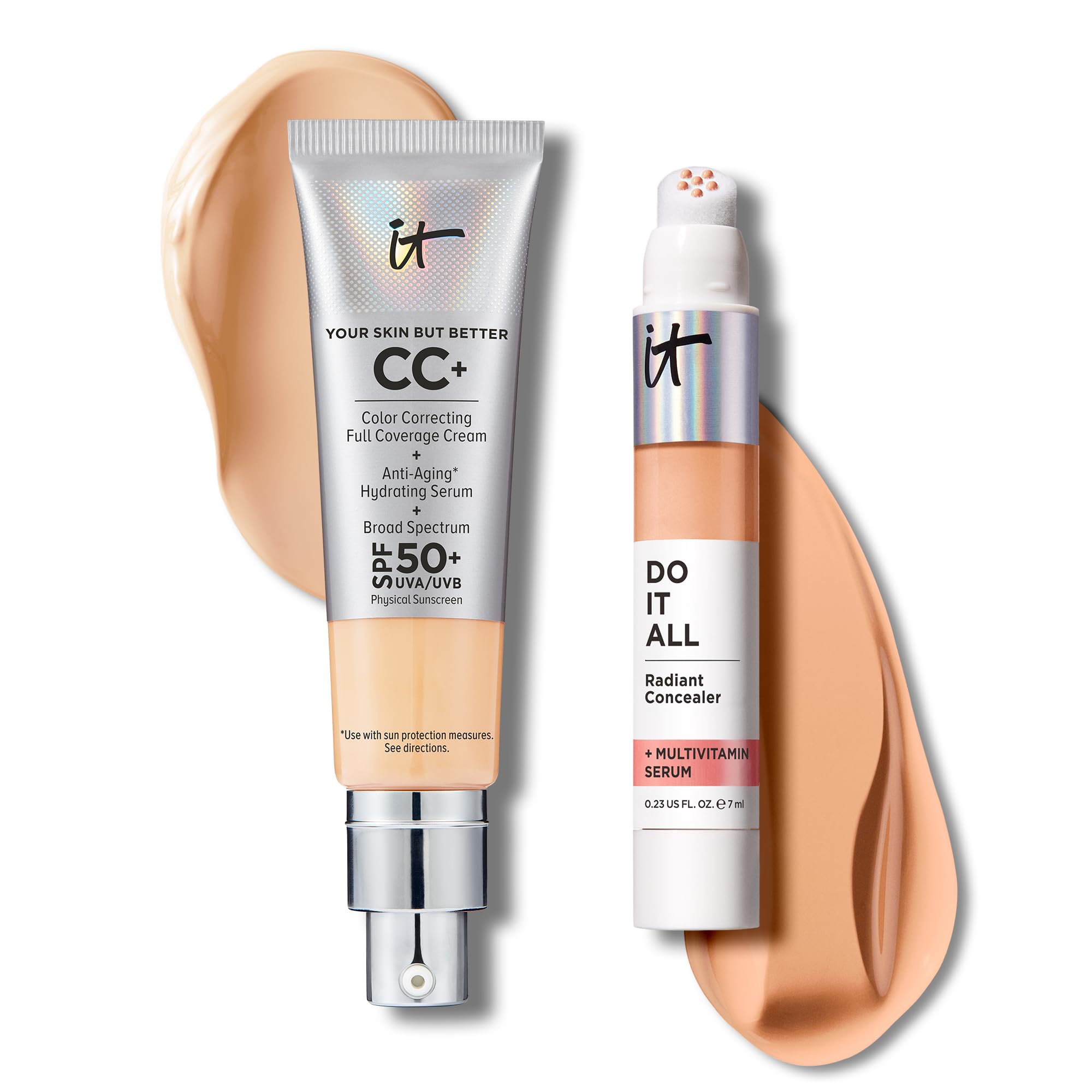 IT Cosmetics CC+ Cream with SPF 50+ Natural Finish Full Coverage Foundation (Light Medium - 1.08 fl oz) & Do It All Radiant Concealer Multivitamin Serum Makeup (305 Medium Neutral - 0.2 fl oz)