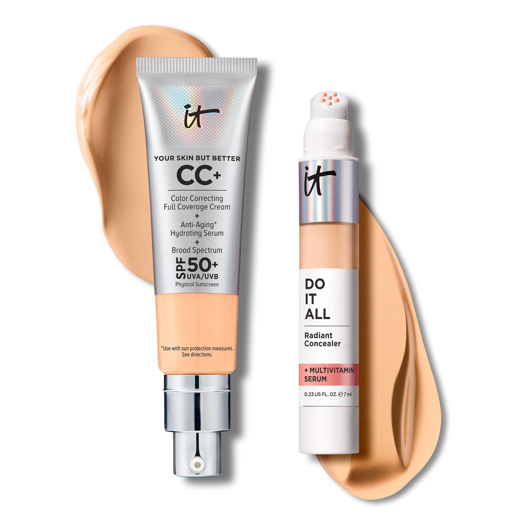 IT Cosmetics CC+ Cream with SPF 50+ Natural Finish Full Coverage Foundation (Light Neutral - 1.08 fl oz) & Do It All Radiant Concealer Multivitamin Serum Makeup (210 Light Neutral - 0.2 fl oz)