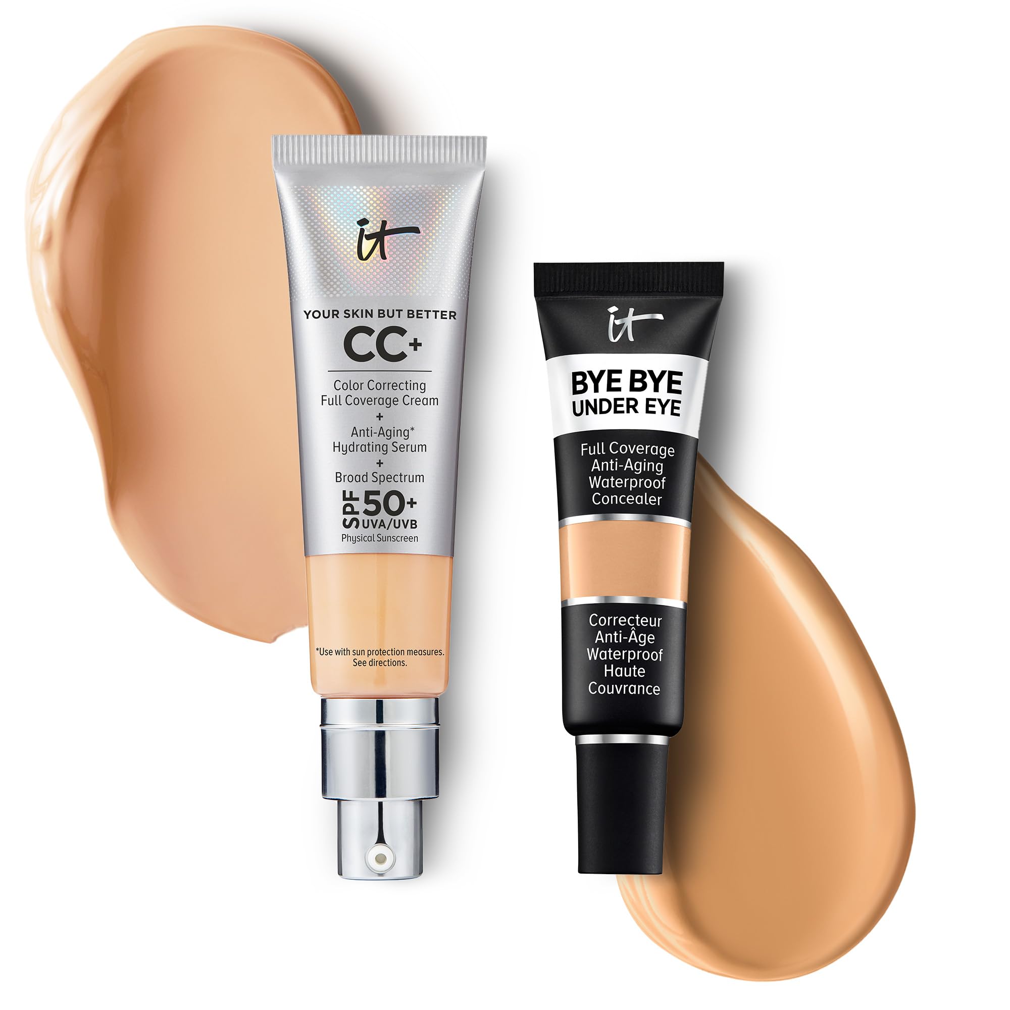 IT Cosmetics CC+ Cream with SPF 50+ Natural Finish Full Coverage Foundation (Medium - 1.08 fl oz) & Bye Bye Undereye Concealer Anti-Aging Makeup (25.0 Medium Natural - 0.4 fl oz)