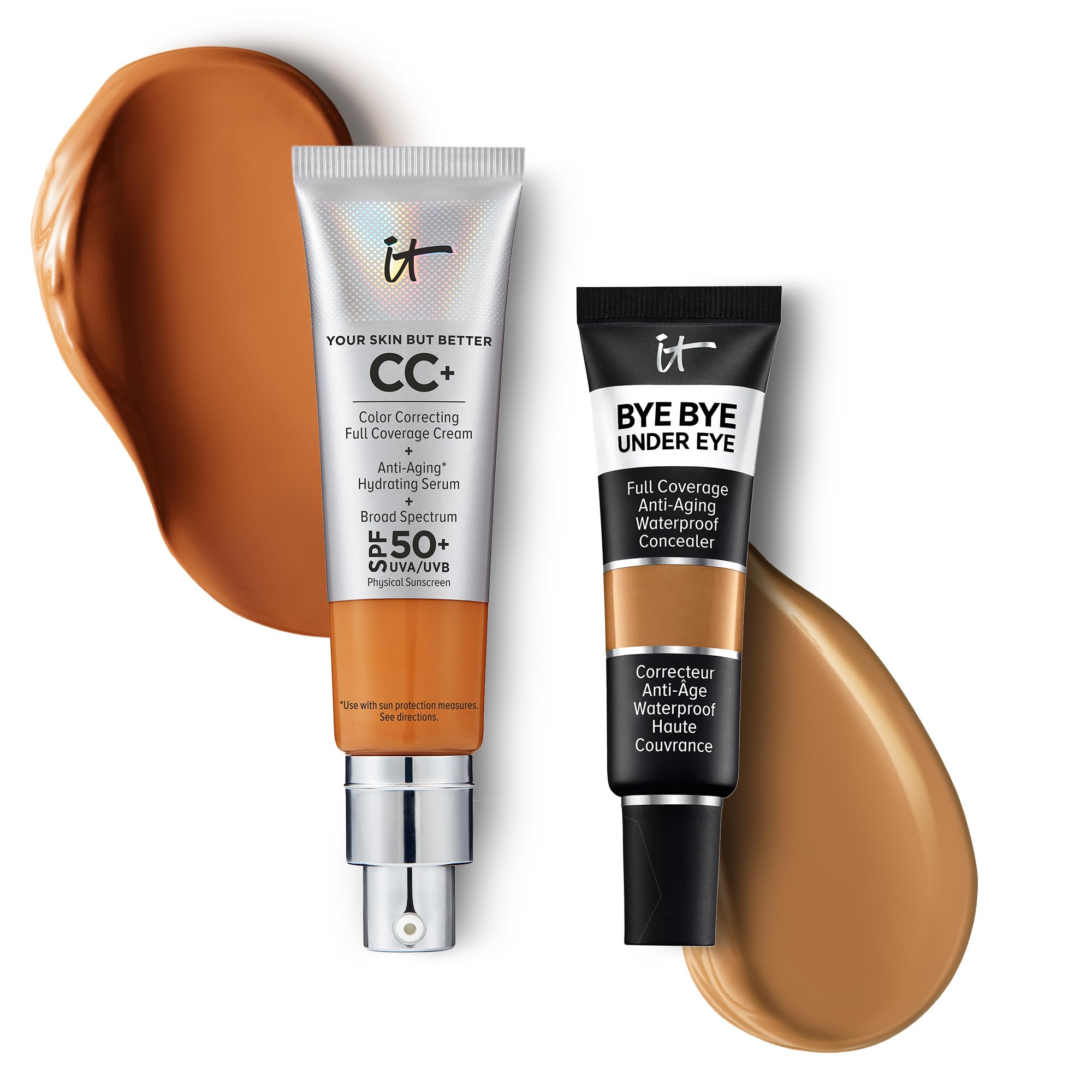 IT Cosmetics CC+ Cream with SPF 50+ Natural Finish Full Coverage Foundation (Rich - 1.08 fl oz) & Bye Bye Undereye Concealer Anti-Aging Makeup (35.0 Rich Amber - 0.4 fl oz)