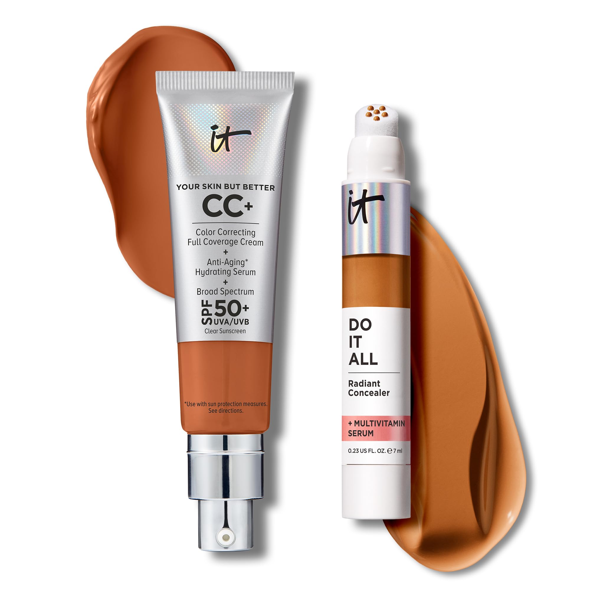 IT Cosmetics CC+ Cream with SPF 50+ Natural Finish Full Coverage Foundation (Rich Cool - 1.08 fl oz) & Do It All Radiant Concealer Multivitamin Serum Makeup (510 Rich Neutral - 0.2 fl oz)