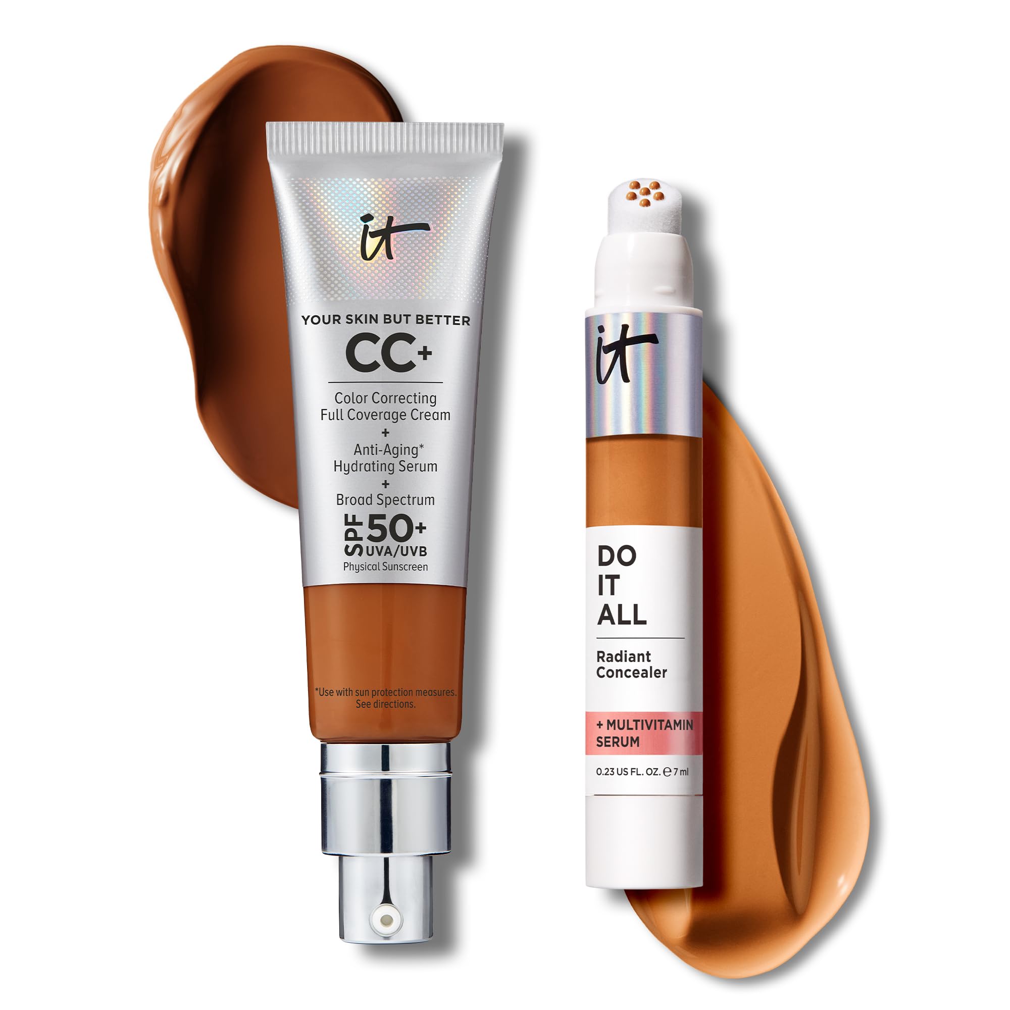 IT Cosmetics CC+ Cream with SPF 50+ Natural Finish Full Coverage Foundation (Rich Honey - 1.08 fl oz) & Do It All Radiant Concealer Multivitamin Serum Makeup (505 Rich Warm - 0.2 fl oz)