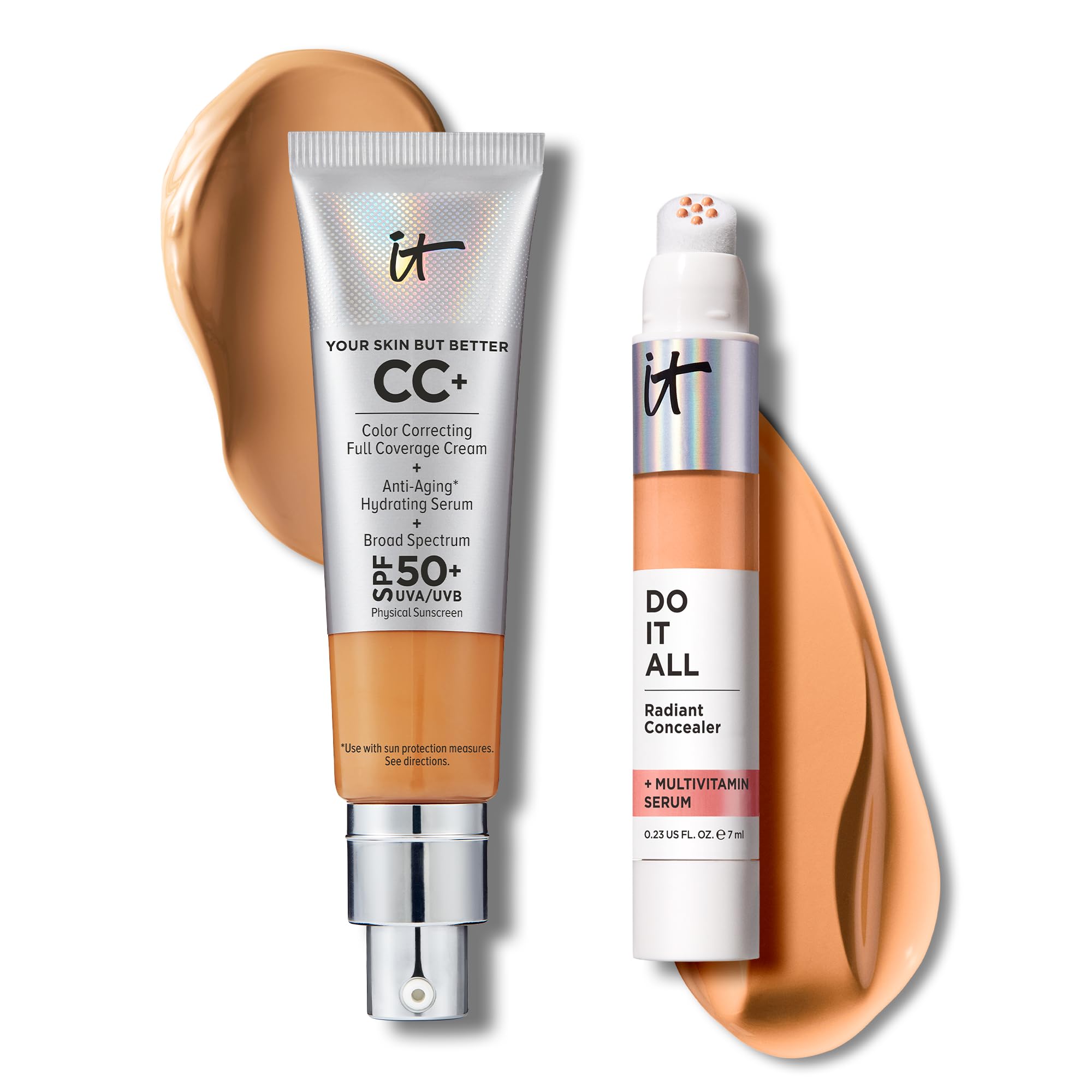 IT Cosmetics CC+ Cream with SPF 50+ Natural Finish Full Coverage Foundation (Tan Warm - 1.08 fl oz) & Do It All Radiant Concealer Multivitamin Serum Makeup (405 Tan Warm - 0.2 fl oz)