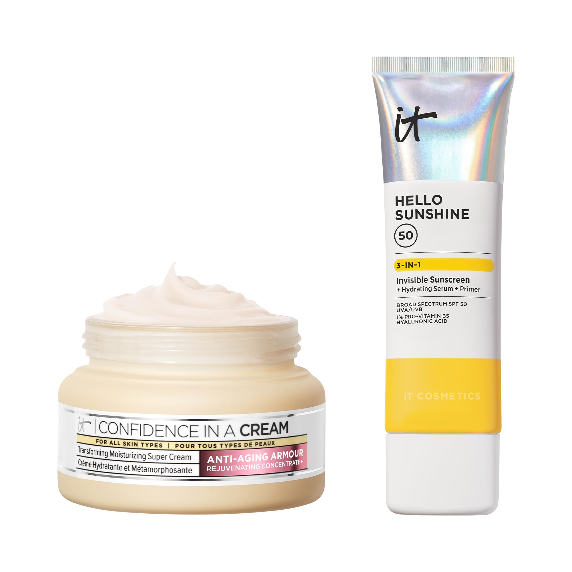 IT Cosmetics Confidence in a Cream & Hello Sunshine SPF 50 Makeup Primers Bundle - Anti Aging Face Moisturizer (2 fl oz) - Invisible Sunscreen with No White Cast (2.7 fl oz)