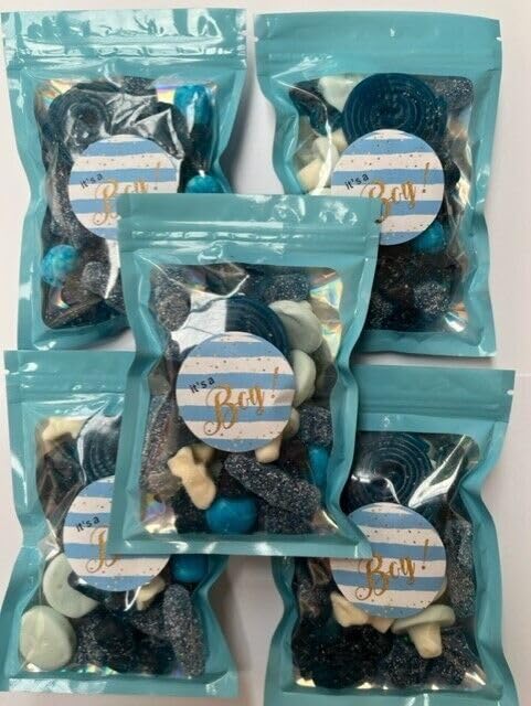 Made To Order Sweet Pick N Mix Treat Pouch Includes a sticker saying "It's a Boy" Perfect baby shower party favour Will be loved by children but also adults too ! Each pouch comes filled to the brim with a variety of tasty sweets! - Mixture of Gummy Jelly Fizzy The bags are filled with approx 100g - sweets and quantity may vary from picture Made to order and we recommend BBE 3 months Please note: These cones are assembled in an area that handles WHEAT, GLUTEN, SOYA, MILK, PEANUTS, NUTS other allergens. Not suitable for vegetarians