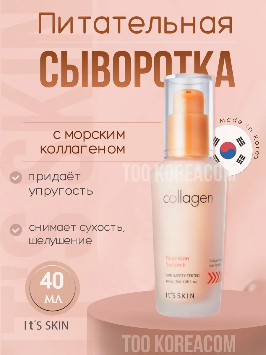 Омолаживающая коллагеновая сыворотка для лица это косметика It’s skin Collagen Nutrition Serum благодаря высокой концентрации коллагена (8000 мг), комплексу растительных экстрактов в составе (ламинарии, соссюреи, толокнянки), маслу манговых косточек, пантенолу и витамину Е интенсивно увлажняет кожу, защищает от преждевременной потери влаги, а также оказывает выраженный антивозрастной эффект, замедляя процессы старения, повышая эластичность и упругость, смягчая и осветляя пигментацию.