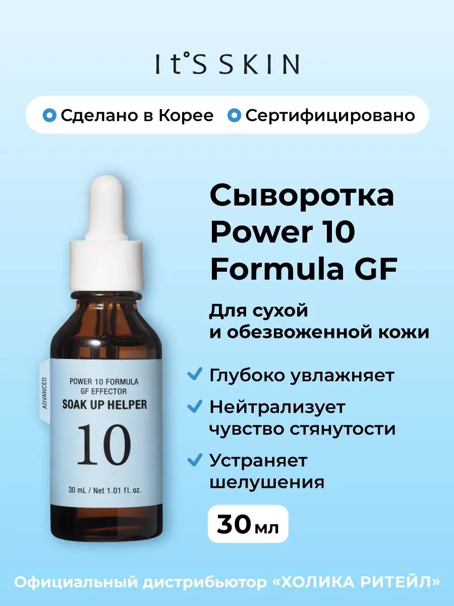 The Power 10 Formula GF Moisturizing Facial Serum from Its Skin will provide perfect hydration! This product is specially designed for dry and dehydrated skin. Ginkgo leaf juice provides a powerful hydrating effect and minimizes moisture loss. The serum normalizes the skin's hydrolipid balance, restoring moisture levels and combating wrinkles and dryness. This serum provides both facial and skin care, making it a great gift for a girlfriend, mother, loved one, or friend. The product is packaged in UV-resistant dark glass, which helps the serum's ingredients remain effective longer. The pull tab on the label allows for easy removal and recycling. Directions: Apply a small amount of product to the skin with light massaging movements, then apply cream and wait for absorption. Search terms: Korean facial cosmetics, Korea, Korean facial serum, Korean brands, ETS Skin, moisturizing facial serum, beauty cosmetics.