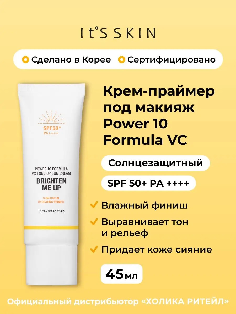 Защищаемся от солнца и про сияние не забываем! В этом деле поможет солнцезащитный крем-праймер Power 10 Formula VC It's Skin, который точно завоюет ваше сердце! Средство содержит гиалуроновую кислоту и комплекс витаминов – они увлажняют и заживляют кожу. Защитный крем от солнца ложится без эффекта маски, надёжно бережёт лицо от ультрафиолета (SPF 50+), продлевает стойкость макияжа, держится целый день, а также дарит лёгкое сияние. Корейский солнцезащитный крем протестирован дерматологами. Способ применения: наносите базу минимум за полчаса до макияжа и выхода на открытое солнце, чтобы средство успело впитаться. Смывать праймер нужно гидрофильным маслом!