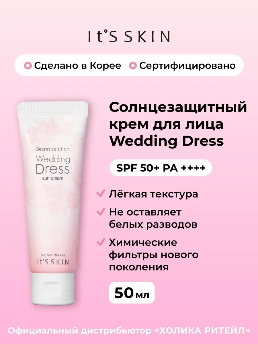 Встречайте самого надёжного защитника на солнечную погоду – солнцезащитный крем Wedding Dress Its Skin! Он легко и быстро впитывается, не выбеливает кожу и не оставляет жирный блеск. Цветочный комплекс увлажняет, экстракт жемчуга дарит сияние, водный флюид удерживает влагу в эпидермисе, а аллантоин успокаивает раздражения. Защитный крем от солнца ложится без эффекта маски, надёжно бережёт лицо от ультрафиолета (SPF 50+), не вызывает прыщей и держится целый день. Корейский солнцезащитный крем протестирован дерматологами. Способ применения: наносите крем за 30 минут до выхода на солнце. Рекомендуем обновлять каждые четыре часа, если вы находитесь на активном солнце и особенно если плаваете или потеете. Смывать солнцезащитный крем советуем гидрофильным маслом.