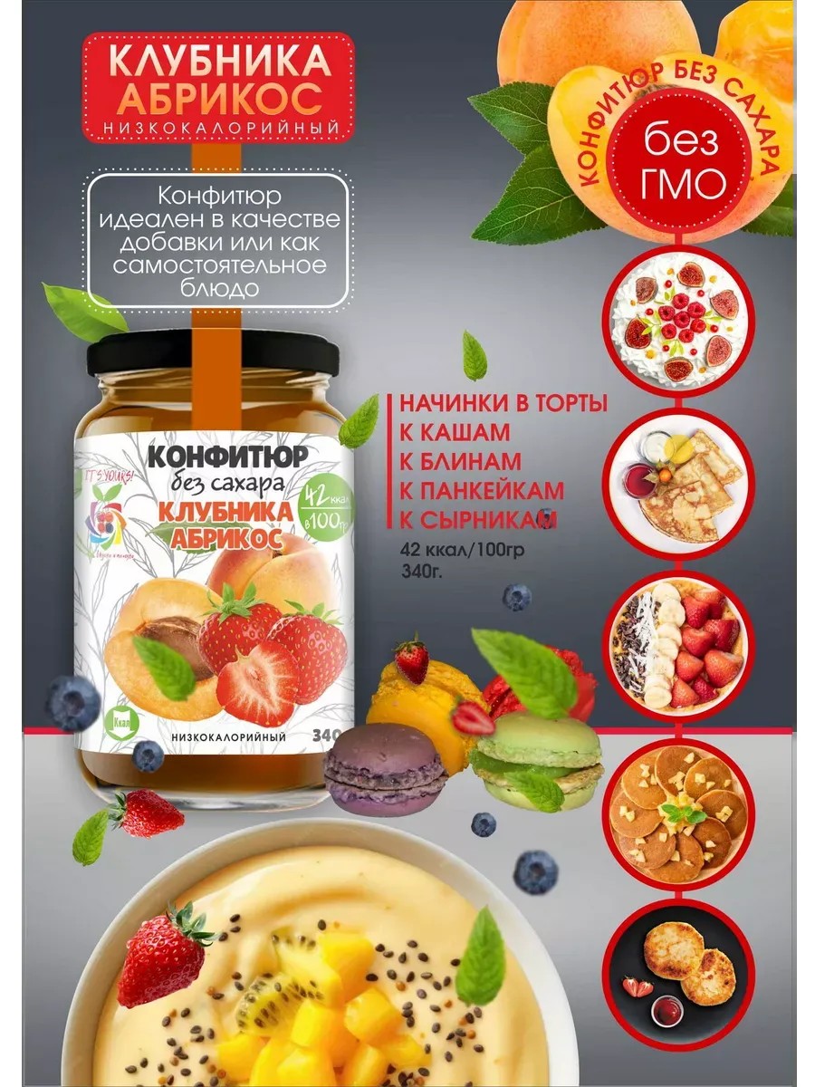 | Вид джема | низкокалорийный; варенье конфитюр топпинг; джем клубника и абрикос без сахара |