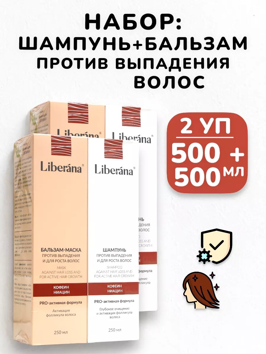 | Комплектация | Шампунь и бальзам против выпадения для роста волос Liberana набор - 500 + 500 мл |