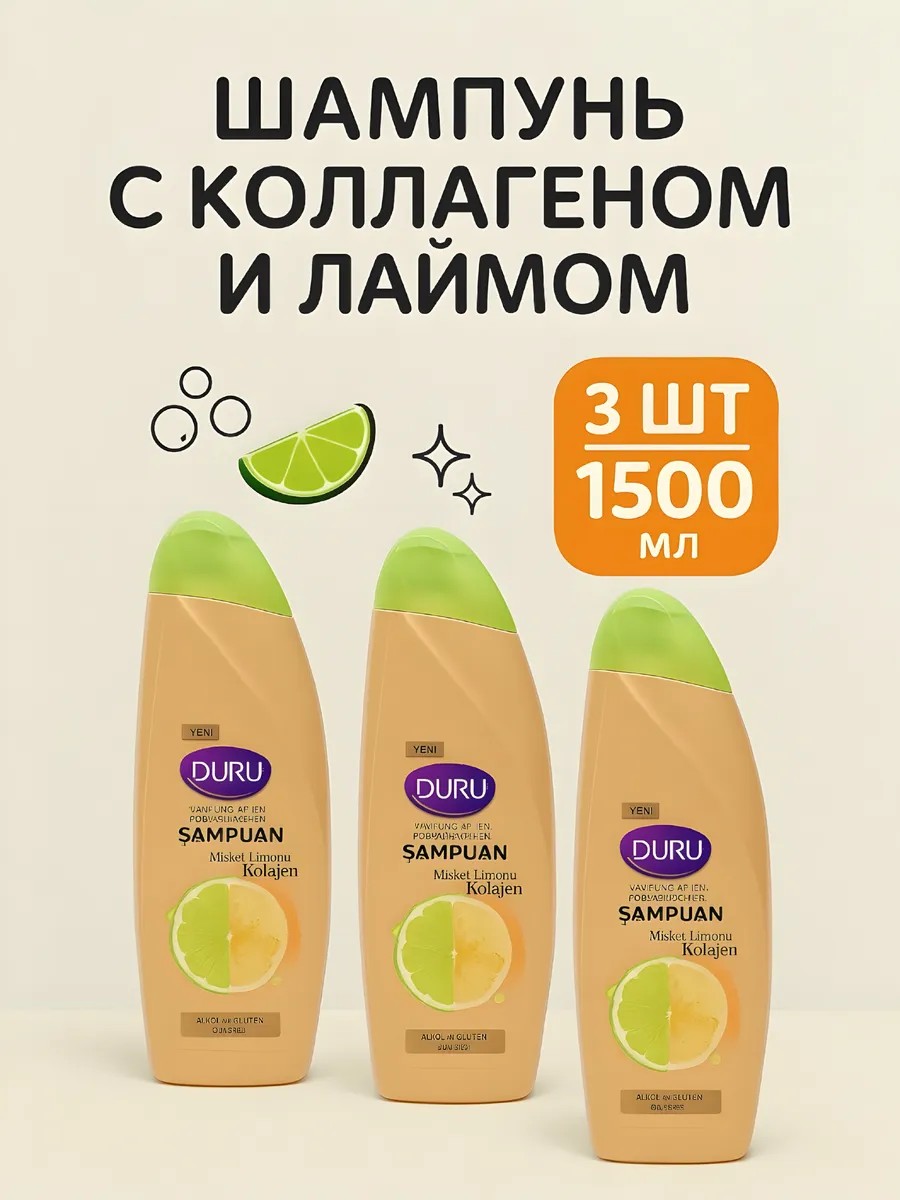 Duru Shampoo with lemon, lime, and collagen for damaged hair restoration.