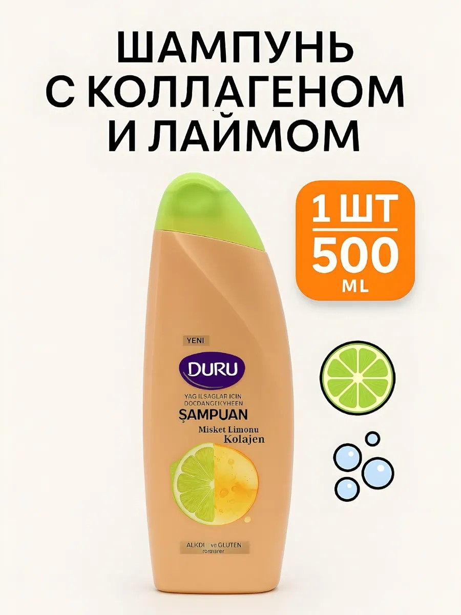 Duru Shampoo with lemon, lime, and collagen for damaged hair restoration.