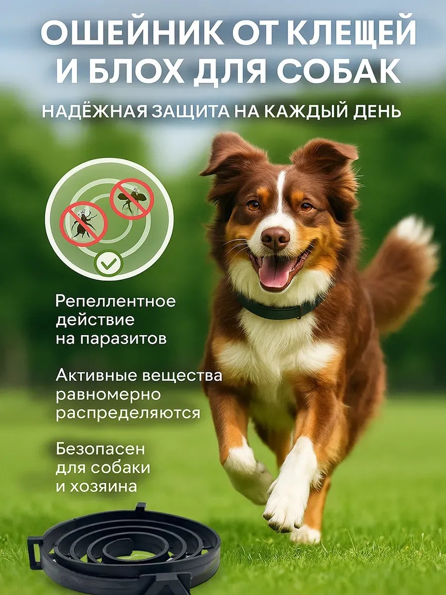 Thoughtful ergonomics: the soft strap is easily adjusted to fit the circumference, the fasteners do not snag fur, and the collar securely fits the neck. This collar is comfortable and adjustable for medium and large breeds; if desired, there is space for a tracker or ID tag. This collar is recommended for outdoor use and walks, as well as for field use—an anti-tick collar for the dacha and forest.