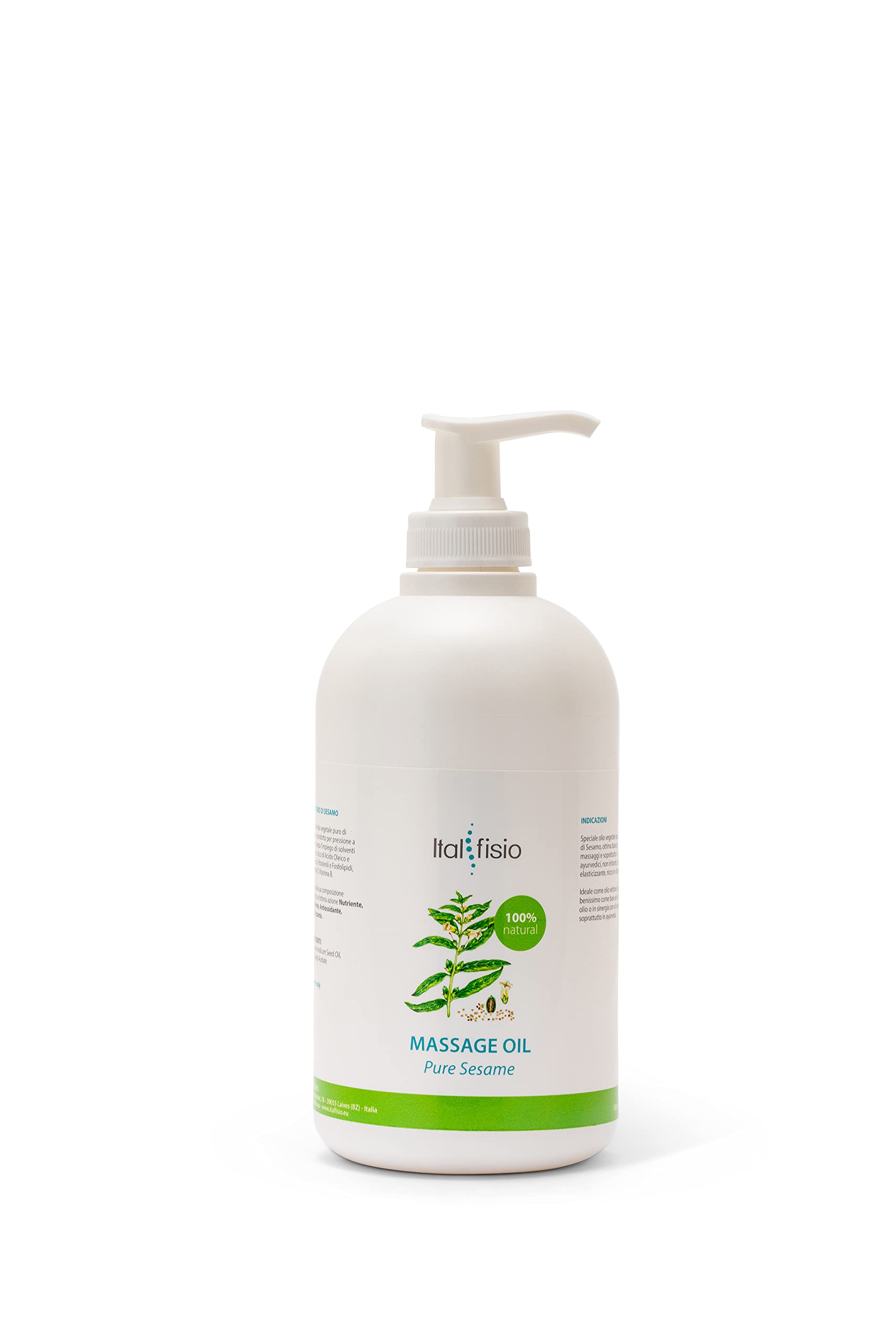 Ingredients: sesamum seed oil, Tocopheryl acetate pure sesame oil Special pure vegetable oil made of sesame, produced by cold pressing without the use of organic solvents, rich in oil and linoleic acid, phytosterols and phospholipids, vitamin E, vitamin B. Thanks to its composition. It has an excellent nourishing, Plea -made, antioxidant and elastic effect.Indications Special purely vegetable sesame oil, excellent basis for massages and especially Ayurvedic massages, not irritating, moisturizing and elastic, rich in vitamin E. Ideal as a carrier oil, it is very well suited as a basis for a single oil or in synergy with etheric oils, especiallyin Ayurveda.cold pressed without using solvents.Rich of oil and linoleic acid, phytosterols and phospholipids, vitamin E, vitamin B. Thanks to its composition, it has an excellent nourishing, plasticizing, antioxidant and elasticifying effect.Not tested on animals.Sesame oil, 100 % natural.for physiotherapy, sports massage and professional use. ZUTATEN: Sesamum Indicum Seed Oil, Tocopheryl Acetate REINES SESAMÖL Spezielles reines Pflanzenöl aus Sesam, hergestellt durch Kaltpressung ohne Verwendung organischer Lösungsmittel, reich an Öl- und Linolsäure, Phytosterolen und Phospholipiden, Vitamin E, Vitamin B. Dank seiner Zusammensetzung Es hat eine ausgezeichnete nährende, weichmachende, antioxidative und elastifizierende Wirkung. INDIKATIONEN Spezielles rein pflanzliches Sesamöl, hervorragende Basis für Massagen und insbesondere ayurvedische Massagen, nicht reizend, feuchtigkeitsspendend und elastisch, reich an Vitamin E. Ideal als Trägeröl, eignet es sich sehr gut als Basis für ein einzelnes Öl oder in Synergie mit ätherischen Ölen, insbesondere im Ayurveda.Kaltgepresst ohne Verwendung von Lösungsmitteln. reich an Öl- und Linolsäure, Phytosterolen und Phospholipiden, Vitamin E, Vitamin B. Dank seiner Zusammensetzung hat es eine ausgezeichnete nährende, weichmachende, antioxidative und elastifizierende Wirkung. Nicht an Tieren getestet. Sesamöl, 100 % natürlich. für Physiotherapie, Sportmassage und den professionellen Einsatz.Italfisio - Professionelles Massageöl und Physiotherapie | 100% Sesamöl 500 ml – für Gesichts- und Körpermassage Aromatherapie
