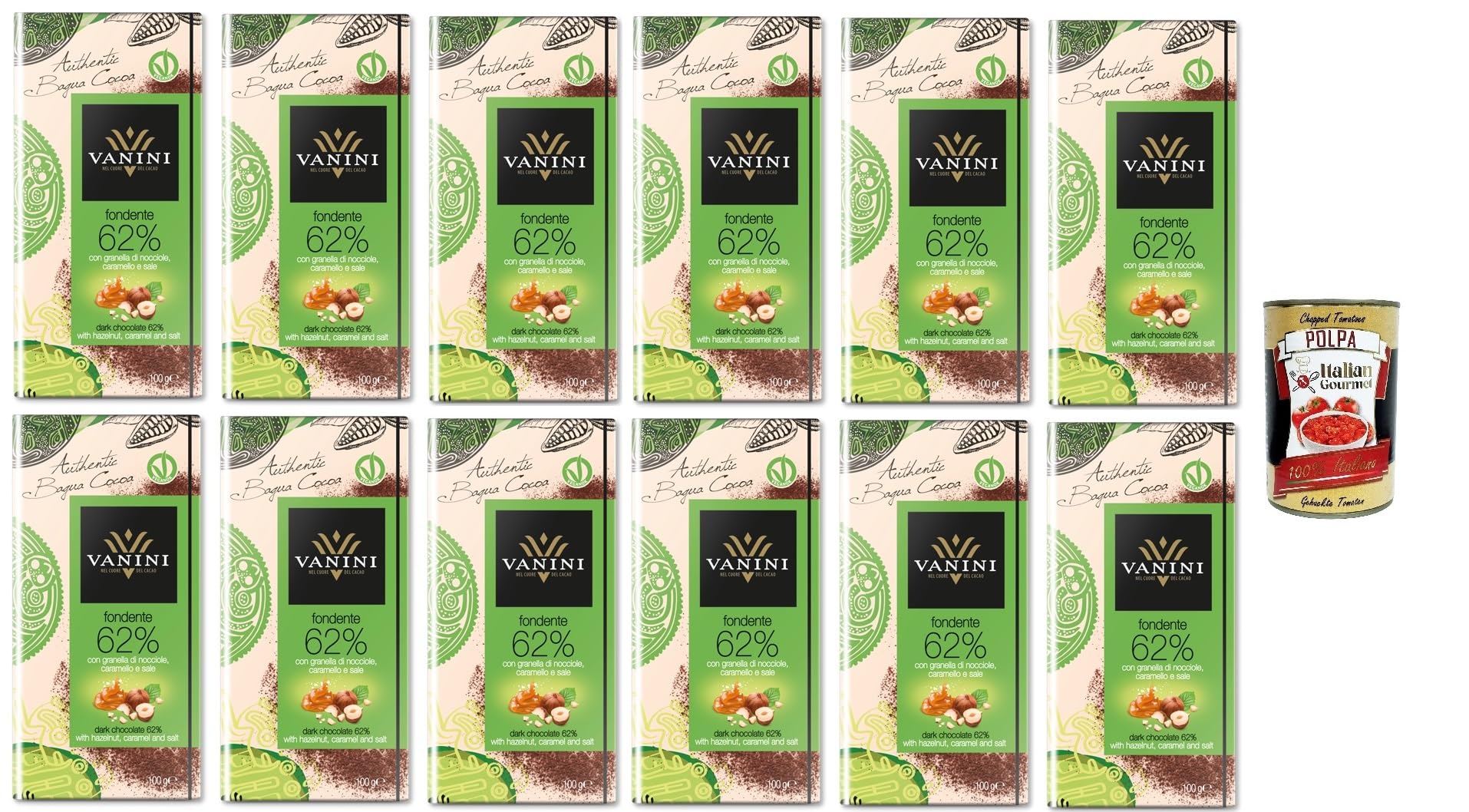 Italian Gourmet E.R. 12 x Vanini Nuova Bagua Dark Chocolate 62% with chopped hazelnuts caramel and salt 100g + Italian gourmet polpa 400g