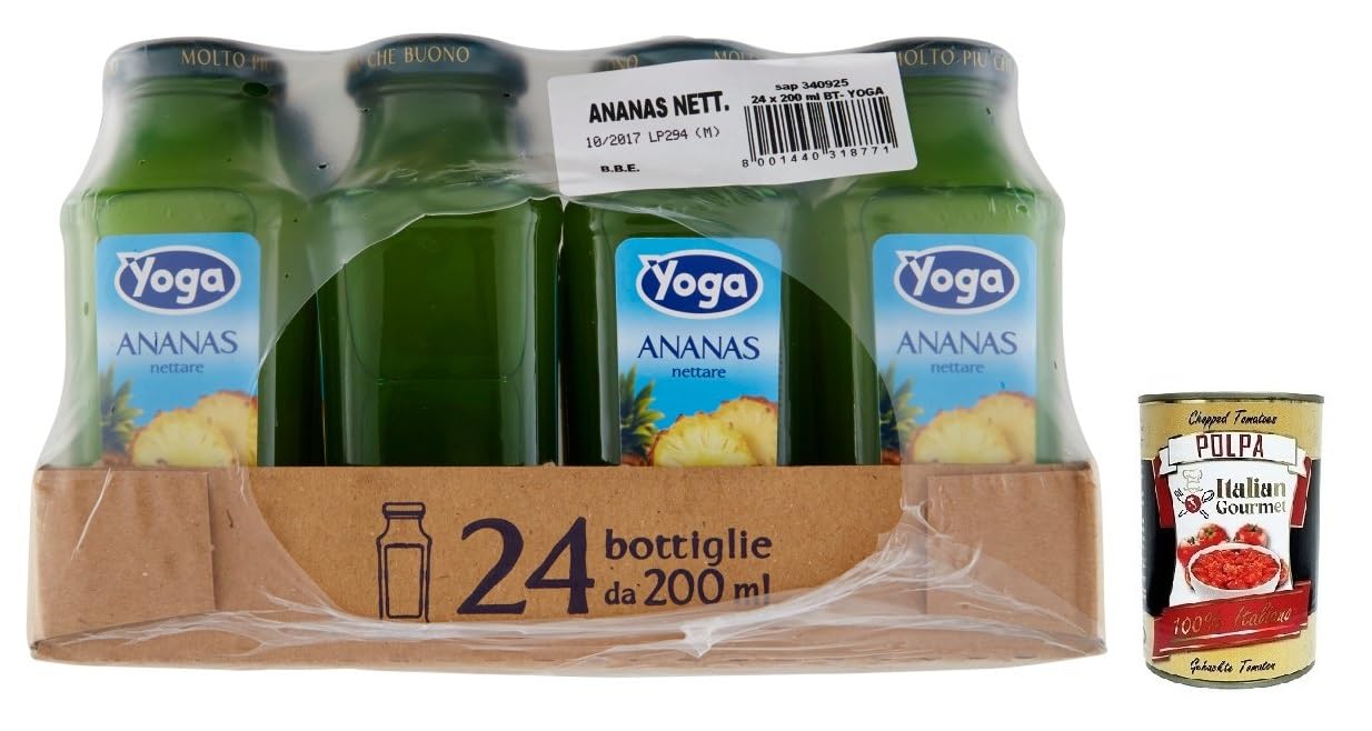 24 x Yoga Succo Ananas Nettare, jus d'ananas, jus de fruits rafraîchissant, goût tropical, verre de 200 ml boîte italienne Polpa di Pomodoro 400 g