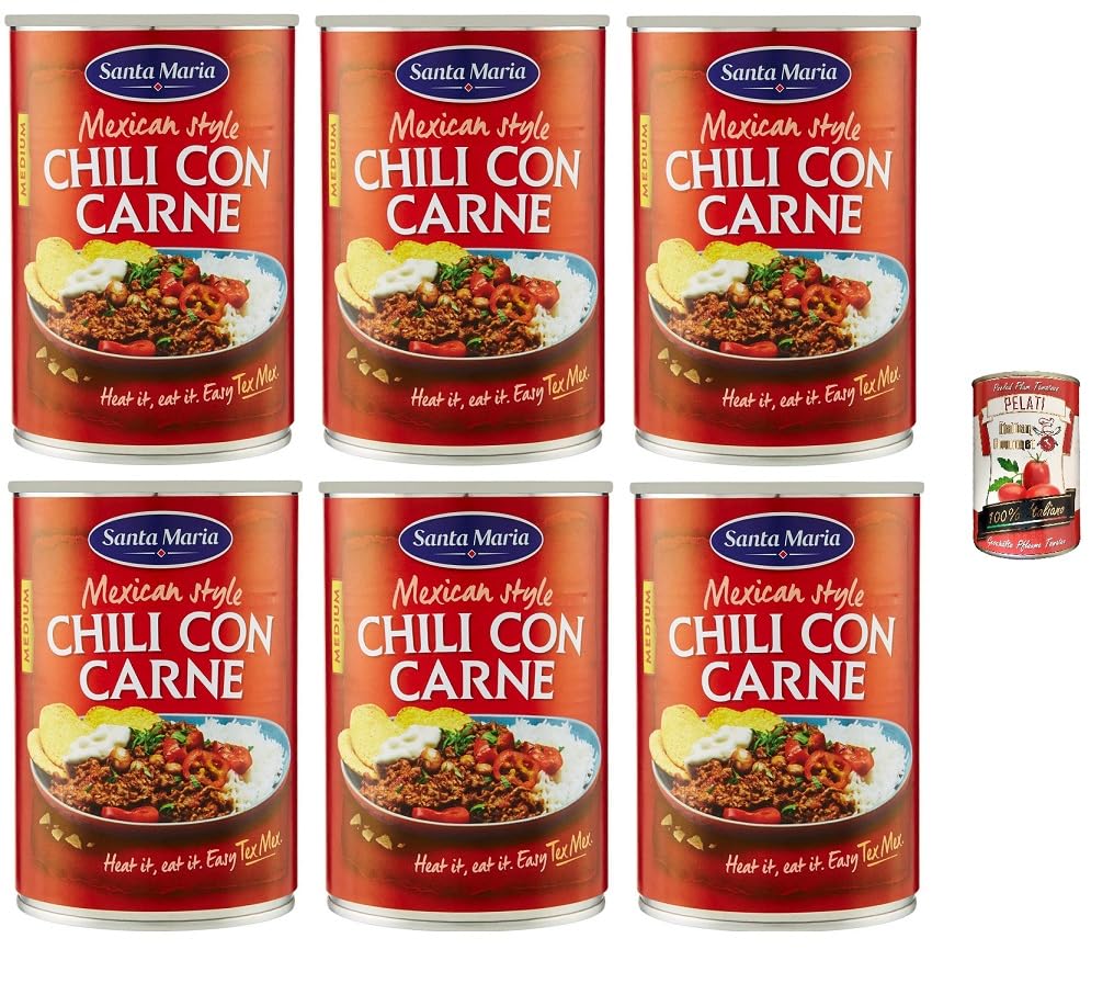 6 x Santa Maria, Chili con Carne, plat légèrement épicé de la cuisine Tex-Mex, pour remplir des tacos ou servir avec des chips tortilla, 410 g Italian Gourmet Pelati 400 g