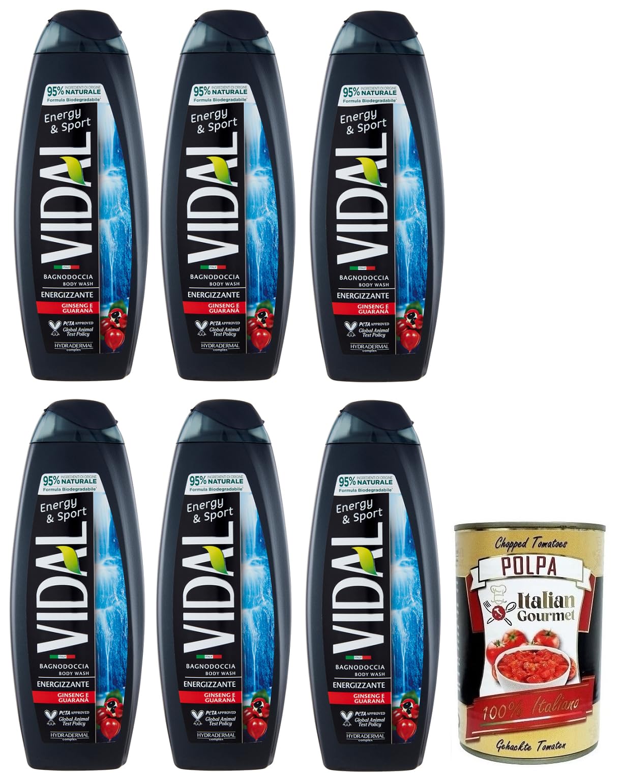 Ingredients: Aqua, Sodium Laureth Sulfate, Cocamidopropyl Betaine, Sodium Chloride, Parfum, Paullinia Cupana, Panax Seed Extract, Ginseng Root Extract, Sorbitol, Glycerin, Sodium PCA, Polyquaternium-7, PEG-40, Hydrogenated Castor Oil, Propylene Glycol, Styrene Acrylic Disodium Copolymer around EDTA, Trium NaLactate, Lactic Acid, Citric Acid, DMDM, Hydantoin, Methylchlorisothiazolinone, Methylisothiazolinone, Coumarin, Hexyl Cinnamal, Limonene, Linalool, CI 14720, CI 42090. The formula is enriched with innovative Hydradermal technology, a complex of dermo-cosmetic active ingredients with a moisturizing action that makes the skin softer, velvety, and radiant. The fragrance opens with the sparkling citrus notes of grapefruit, which combine with spicy and woody accords that linger on the skin. Enriched with invigorating and stimulating ginseng and guarana extracts, it brings renewed energy and strength to the entire body. Free Italian gourmet Polpa di Pomodoro, 400g tin.Lot de 6 gels douche Vidal Energy Sport Bagnodoccia avec ginseng et guarana, 500 ml Polpa di Pomodoro Italian Gourmet Polpa di Pomodoro 400 gIngrédients Aqua laureth sulfate de sodium Cocamidopropylbétaïne Chlorure de sodium Parfum Paullinia Cupana Extrait de graines de Panax Extrait de racine de ginseng Sorbitol Glycérine Sodium-PCA Polyquaternium-7 PEG-40 Huile de ricin hydrogénée Propylène Glycol Styrène Acrylique Copolymère disodique autour de l'EDTA NaLactate de trium, acide lactique, acide citrique DMDM, hydantoïne, méthylchlorisothiazolinone, méthylisothiazolinone, coumarine, hexylcannelle, limonène, linalol, CI 14720 CI 42090. La formule est enrichie de la technologie innovante Hydradermal, un complexe d'actifs dermocosmétiques à action hydratante qui rend la peau plus douce, veloutée et éclatante. Le parfum commence par les notes d'agrumes pétillantes du pamplemousse qui se combinent avec les accords épicés et boisés qui restent longtemps sur la peau. Avec des extraits de ginseng et de guarana aux propriétés tonifiantes et stimulantes, il apporte une nouvelle énergie et force à tout le corps. Polpa di Pomodoro Gourmet italienne gratuite, boîte de 400 g.