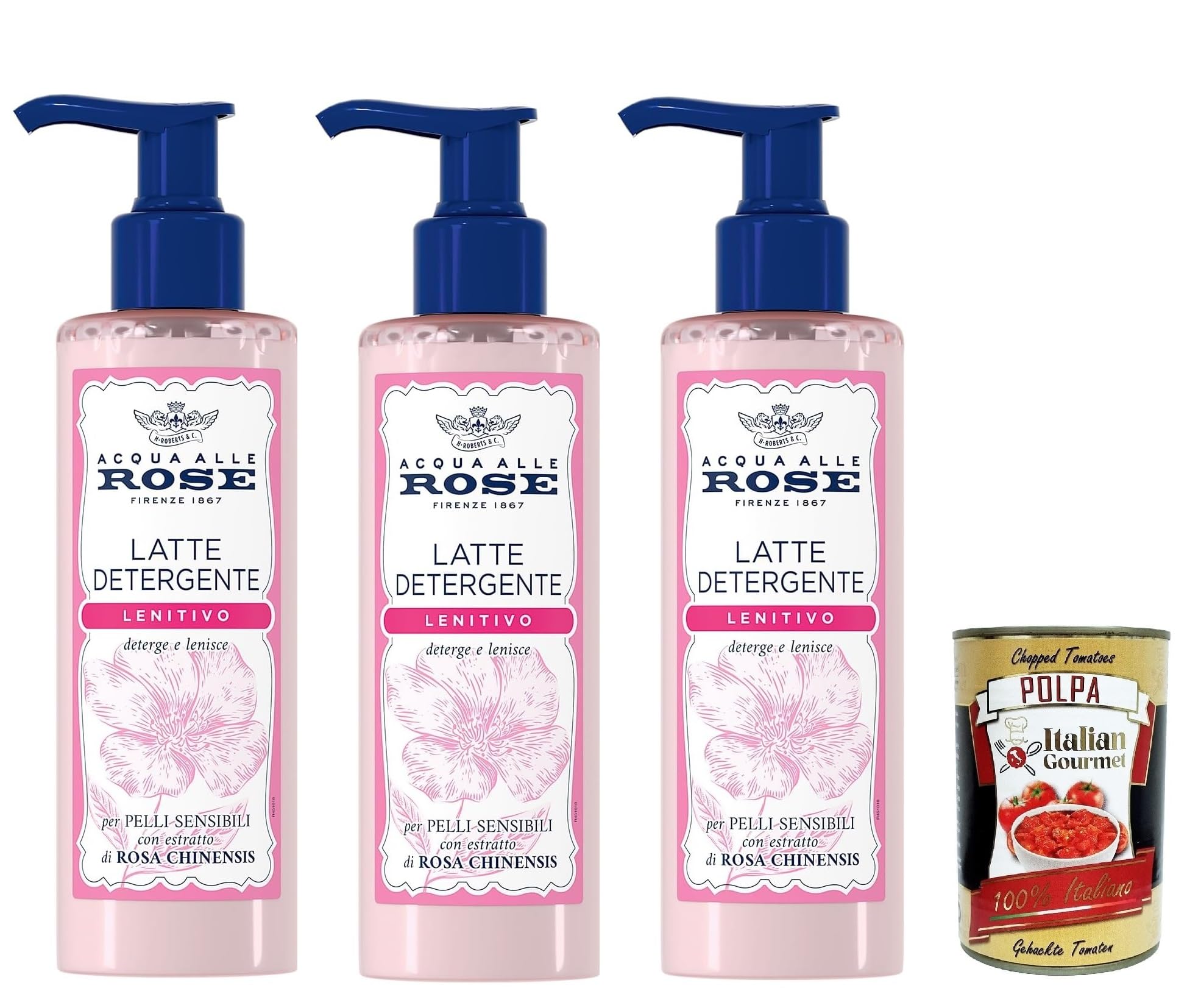 Ingredients: aqua, isopropyl isosterate, glycerin, capryl capra triglyceride, octyldodecanol, isohexadecane, glycerin stearate, PEG-100 stearate, cetearyl alcohol, rose lysate, rose gallois flower water, xanthan gum, acrylic C10-80-30-30-30. 0 to 80. Bromide 30-8, sodium gluconate, sodium hydroxide, butyrospermum parkii (shea) butter, tocopheryl acetate, citric acid, phenoxyethanol, parfum (fragrance), sodium benzoate INGREDIENTS Ingredients: aqua (water), coconut goat caprylate, glycerin, cableium polyacryledimethyl taurate, denatured alcohol gluconate, sodium hydroxide, CI 42051 (red 7.5), CI 28440 (red 7.5), amyl cinnamal, citronellol, geraniol, hydroxycitronellal, lindaloin SAFETY WARNING Apply morning and evening to uncovered facial skin. Gently massage until fully absorbed. See moreFor optimal results, use the Soothing Cleansing Milk in combination with other products in the Soothing line. Use daily to create and soothe even the most sensitive skin and prepare it for treatments. Contains Rose Chinensis extract, which helps soothe the skin and protect it from external aggressors. The milk cleanses with a creamy texture and deep cleans while maintaining the skin's moisture level. Free 400g of gourmet Italian tomato pulp.Acqua All Rose Détergent Lenitivo à l'extrait de chinensis rose, idéal pour les peaux sèches ou sensibles, nettoie et hydrate la peau en douceur, 3 x 200 ml Italian Gourmet Polpa 400 gDESCRIPTION DU PRODUIT DESCRIPTION DU PRODUIT Ingrédients : aqua, isopropylique isostérate, glycérine, capryl capa triglycéride, octyldodécanol, isohexadécane, stéarate de glycérine, stéarate de PEG-100, alcool cétéarylique, lysat rose lysat, eau de fleur de rose gauloise, gomme xanthane, acrylique C10-80-30-30-30. 0 à 80. Bromure 30-8, gluconate de sodium, hydroxyde de sodium, beurre de butyrospermum parkii, acétate de tocophérol, acide citrique, phénoxyéthanol, parfum, benzoate de sodium INGRÉDIENTS Ingrédients : aqua, caprylate de coco chèvre, glycérine, cableium polyacrylediméthyl taurate, alcool dénaté gluconate, hydroxyde de sodium, CI 42051, CI 28440, amylcinnamal, citronellol, géraniol, hydroxycitronellal, lindalol AVERTISSEMENT DE SÉCURITÉ Appliquer matin et soir sur la peau du visage déjà découvert. Il masse doucement jusqu'à ce qu'il soit complètement absorbé. Voir plusPour des résultats optimaux, utilisez du lait nettoyant apaisant en combinaison avec les autres produits de la ligne apaisante. Utilisez quotidiennement pour créer et apaiser même les peaux les plus sensibles et les préparer à l'application des traitements. Contient de l'extrait rose de Chinensis qui aide à apaiser la peau et à la protéger des agents externes. Nettoie le lait avec une texture crémeuse et des nettoyages en profondeur tout en maintenant le niveau d'hydratation de la peau. Polpa di pomodoro italien gourmet gratuit 400 g.