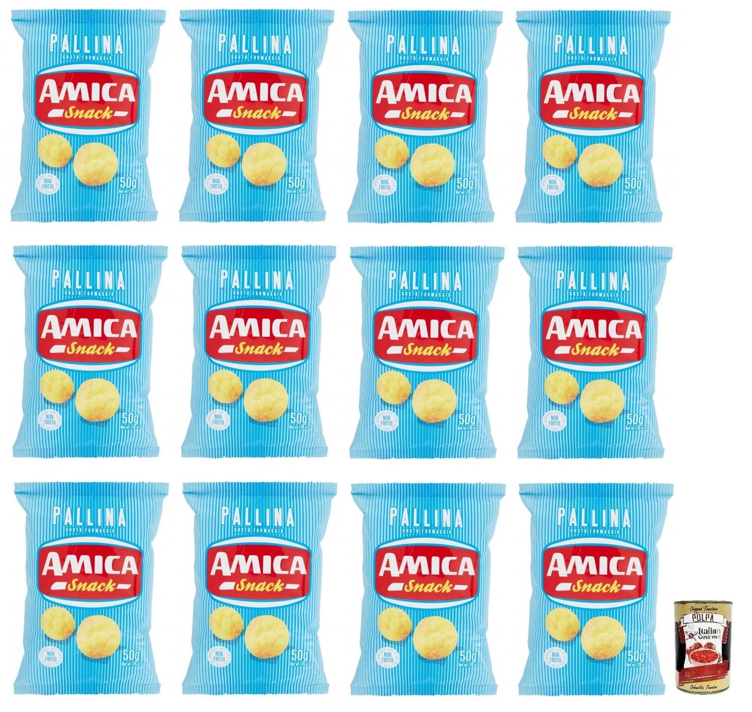 Amica Chips Pallina al Formaggio Lot de 12 collations au maïs aromatisées au fromage Sachet de 50 g boîte italienne Gourmet Polpa di Pomodoro 400 g
