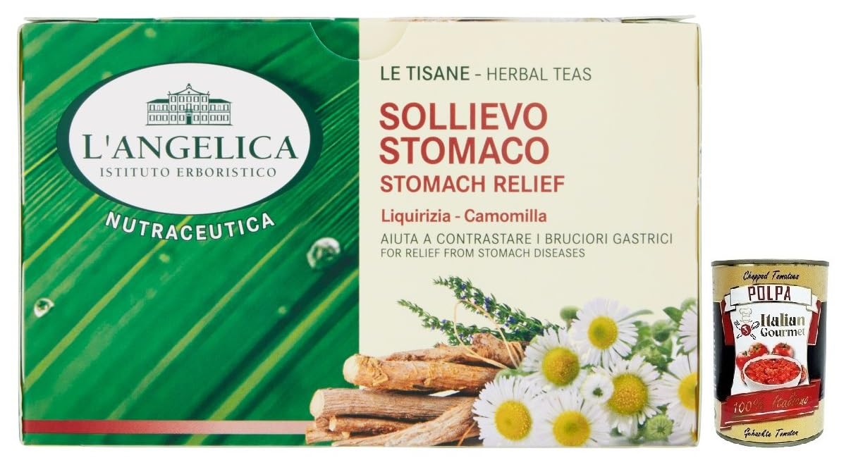Italian Gourmet E.R. Angelica Tisana Sollievo Stomaco a remedy for heartburn herbal tea with a blend of licorice and chamomile pack of 20 filters + Italian Gourmet Polpa di Pomodoro 400g