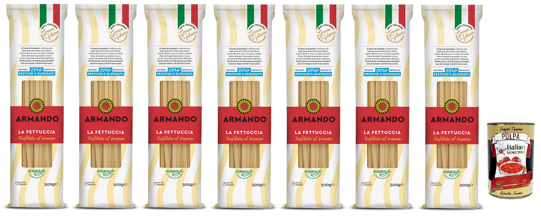 Free Italian Gourmet Polpa di Pomodoro 400g Box FETTUCCIA: Versatile and light. Ideal for first courses with sauces for fish, shellfish, or game. Armando Pasta: 100 Italian durum wheat semolina noodles, coarsely drawn and slowly dried, processed according to the traditional method. Its distinctive taste is recognizable among thousands. CONTROLLED DELIVERY: The wheat is grown exclusively by farmers in the ARMANDO supply chain, guaranteeing that no pesticide or glyphosate residues are used in the cultivation and storage of the wheat. COOKING TIME: 10 minutes for "al dente" pasta and 12 minutes for fully cooked. The coarse shape and careful selection of durum wheat ensure that the pasta is always al dente, delicious, and healthy. With a protein content of 14 . ECO-FRIENDLY PACKAGING: Thanks to its fully recyclable paper packaging, ARMANDO respects the environment. Ingredients: Durum wheat semolina. May contain soy and mustard. Store in a cool, dry place. Country of origin: Italy. Average nutritional values per 100g: Energy 1503 kJ 354 kcal Fat 1.3g, of which 0.3g saturates Carbohydrate 70.3g, of which sugars 3.2g Fiber 2.7g Protein 14g Salt 0.05g. INGREDIENTS Durum wheat semolinaArmando La Fettuccia Lot de 7 pâtes bronzées 100 italiennes 500 g Polpa di Pomodoro Italian Gourmet Polpa di Pomodoro Boîte de 400 gDESCRIPTION DU PRODUIT DESCRIPTION DU PRODUIT Gratuit Italian Gourmet Polpa di Pomodoro 400g Boîte FETTUCCIA: Polyvalent et léger. Idéal pour les premiers plats avec sauces de poisson, mollusques ou gibiers. Pâte Armando : 100 nouilles de semoule de blé dur italiennes, grossièrement tirées et séchées lentement, transformées selon la méthode traditionnelle. Son goût particulier est reconnaissable parmi des milliers DE LIVRAISON CONTRÔLÉE : Le blé est cultivé uniquement par les agriculteurs de la chaîne d'approvisionnement ARMANDO, ce qui garantit qu'aucun résidu de pesticides et de glyphosate ne sera utilisé dans la culture et la conservation du blé TEMPS DE CUISINE: 10 minutes pour les pâtes "al dente" et 12 minutes pour la cuisson complète en La forme grossière et la sélection minutieuse du blé dur garantissent que les pâtes sont toujours al dente, bonnes et saines. avec une teneur en protéines de 14 EMBALLAGE ÉCOLOGIQUE : grâce à son emballage en papier entièrement recyclable, ARMANDO respecte l'environnement Ingrédients : semoule de blé dur. Peut contenir du soja et de la moutarde. Conserver dans un endroit frais et sec Pays de transformation : Italie Valeurs nutritionnelles moyennes par 100G Énergie KJ 1503 Kcal 354 Matières grasses 1,3 g dont 0,3 g Acides gras saturés Glucides 70,3 g dont sucre 3,2 g Fibres 2,7 g Protéines 14 g Sel 0,0,0 05 gr INGRÉDIENTS Semoule de blé dur