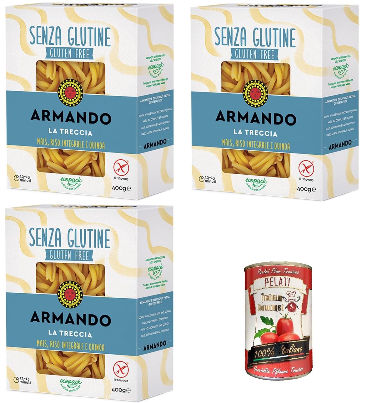 LA TRECCIA: Gluten-free noodle shape. Rough and porous, they pair perfectly with ricotta-based sauces. ARMANDO GLUTEN-FREE Pasta: Armando gluten-free pasta is certified by the Italian Celiac Association (AIC) and is made from naturally gluten-free ingredients. All the quality of Armando pasta, gluten-free. COOK with a selection of corn, brown rice, and quinoa for delicious pasta with a firm texture and excellent cooking stability: for a tasty and healthy dish, we recommend 12 minutes for "al dente" pasta and 13 minutes for fully cooked pasta, guaranteed by the careful selection of raw materials. ECO-FRIENDLY PACKAGING: Bras ando cares about the environment and ensures that the packaging for each of its products is fully recyclable with paper. INGREDIENTS Yellow corn flour (33.7 ), hulled rice flour (22 ), rice flour (21 ), white corn flour (20 ), quinoa flour (3 ), emulsifier E471 mono- and diglycerides of fatty acidsArmando, La Treccia, nouilles multi-grains sans gluten avec maïs, riz brun et quinoa 400 g pelati italien gourmet 400 gDESCRIPTION DU PRODUIT DESCRIPTION DU PRODUIT LA TRECCIA : format de nouilles sans gluten. Rugueuses et poreuses, elles se marient parfaitement avec les sauces à base de ricotta Pasta ARMANDO SANS GLUTEN: les pâtes sans gluten Armando sont certifiées par l'association italienne de la maladie cœliaque AIC et sont fabriquées à partir d'ingrédients naturellement sans gluten. Toute la qualité des pâtes Armando, sans gluten. CUISINER à partir d'une sélection de maïs, de riz brun et de quinoa pour des pâtes gourmandes au goût avec une consistance compacte et une excellente stabilité de cuisson : pour un plat bon et sain, nous vous recommandons 12 minutes pour une pâte "al dente" et 13 minutes pour une cuisson complète, pour un plat bon et sain, garanti par la sélection minutieuse des matières premières. ÉCO-DURABLE EMBALLAGE : Bras ando se soucie de l'environnement et veille à ce que l'emballage de chacun de ses produits soit entièrement recyclable avec du papier INGRÉDIENTS Farine de maïs jaune (33,7 ), farine de riz décortiquée (22 ), farine de riz (21 ), farine de maïs blanc (20 ), farine de quinoa (3 ), émulsifiant E471 mono- et diglycérides d'acides gras alimentaires