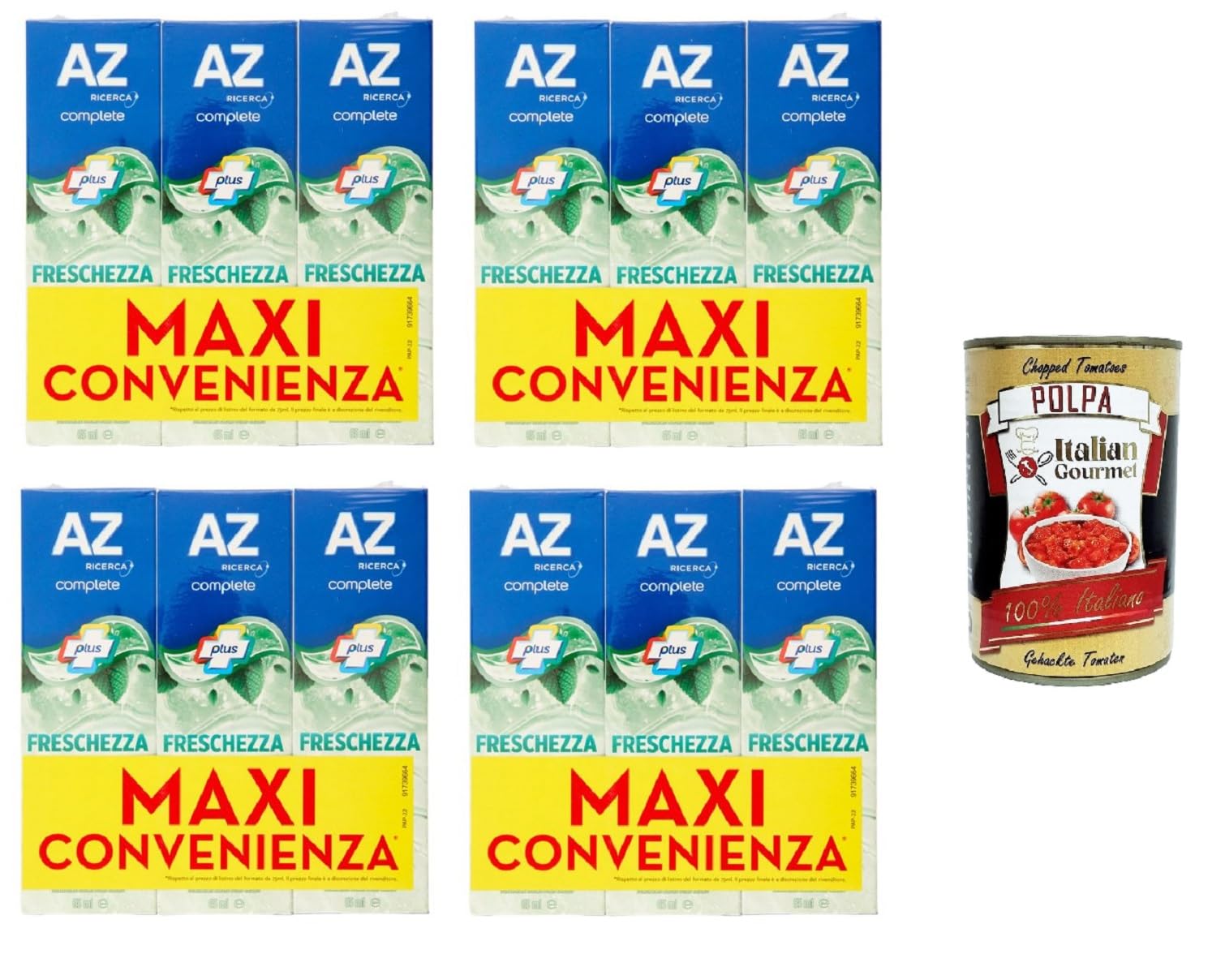 Freshes breath. Cleans and protects against cavities. Removes surface stains. AZ Ricerca Philosophy: At AZ Ricerca, we believe that the best oral hygiene products come from understanding the habits and needs of Italians and their families. The products made in our laboratories are a direct result of what we learn from you. INGREDIENTS Aqua, Sorbitol, Hydrated Silica, Disodium Pyrophosphate, Sodium Lauryl Sulfate, Aroma, Cellulose Rubber, Sodium Hydroxide, Saccharin, Carbomer, Sodium Fluoride, Xanthan Gum, CI 77891, Limonene, Glycerin, Polysorbate 80, CI 74260 SAFETY WARNING Children up to 6 years: Use a small amount of toothpaste under adult supervision to minimize swallowing. If you are taking fluoride from other sources, consult your dentist or doctor. See moreThe products made in our laboratories are a direct result of what we learn from you. AZ Ricerca's philosophy: At AZ Ricerca, we believe that the best oral hygiene products come from understanding the habits and needs of Italians and their families. Freshens breath. Cleans and protects against cavities. Removes surface stains. Free Gourmet Italian Polpa di pomodoro, 400g.AZ Dentifricio Complete Plus Freschezza Delicata Menta Leggera Complete Plus Dentifricio Dentifricio Délicat Fraîcheur Menthe Légère 12 x 65 ml Italian Gourmet Polpa 400 gDESCRIPTION DU PRODUIT DESCRIPTION DU PRODUIT Rafraîchit l'haleine. Nettoie et protège contre les caries. Élimine les taches superficielles Philosophie d'AZ Ricerca : chez AZ Ricerca, nous pensons que les meilleurs produits d'hygiène bucco-dentaire proviennent de la connaissance des habitudes et des besoins des Italiens et de leurs familles. Les produits fabriqués dans nos laboratoires sont le résultat direct de ce que nous apprenons de vous. INGRÉDIENTS Aqua Sorbitol Acide silice hydraté Pyrophosphate disodique Laurylsulfate de sodium Arôme Caoutchouc cellulose Hydroxyde de sodium Saccharine Carbomère Fluorure de sodium Xanthane CI 77891 Limonène Glycérine Polysorbate 80 CI 74260 AVERTISSEMENT DE SÉCURITÉ Enfants jusqu'à 6 ans : utilisez une petite quantité de dentifrice sous la surveillance d'un adulte pour minimiser l'ingestion. Si vous prenez du fluorure provenant d'autres sources, consultez votre dentiste ou votre médecin. Voir plus. Les produits fabriqués dans nos laboratoires sont le résultat direct de ce que nous apprenons de vous. Philosophie d'AZ Ricerca : chez AZ Ricerca, nous pensons que les meilleurs produits d'hygiène bucco-dentaire proviennent de la connaissance des habitudes et des besoins des Italiens et de leurs familles. Rafraîchit l'haleine. Nettoie et protège contre les caries. Élimine les taches superficielles. Gourmet Italian Gourmet Polpa di pomodoro gratuit, 400 g.
