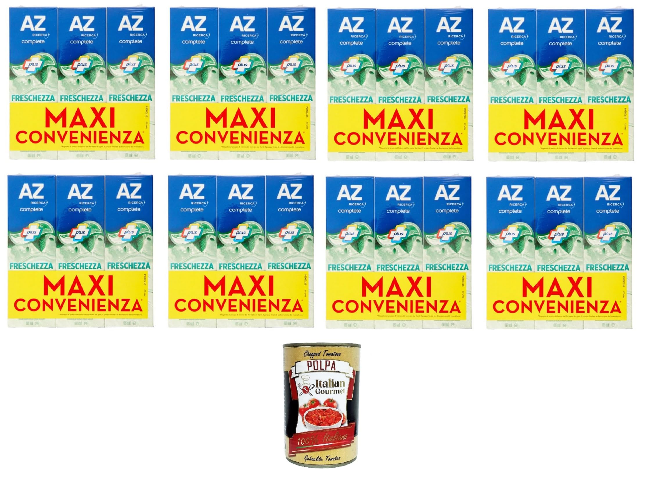 Freshes breath. Cleans and protects against cavities. Removes surface stains. AZ Ricerca Philosophy: At AZ Ricerca, we believe that the best oral hygiene products come from understanding the habits and needs of Italians and their families. The products made in our laboratories are a direct result of what we learn from you. INGREDIENTS Aqua, Sorbitol, Hydrated Silica, Disodium Pyrophosphate, Sodium Lauryl Sulfate, Aroma, Cellulose Rubber, Sodium Hydroxide, Saccharin, Carbomer, Sodium Fluoride, Xanthan Gum, CI 77891, Limonene, Glycerin, Polysorbate 80, CI 74260 SAFETY WARNING Children up to 6 years: Use a small amount of toothpaste under adult supervision to minimize swallowing. If you are taking fluoride from other sources, consult your dentist or doctor. See moreThe products made in our laboratories are a direct result of what we learn from you. AZ Ricerca's philosophy: At AZ Ricerca, we believe that the best oral hygiene products come from understanding the habits and needs of Italians and their families. Freshens breath. Cleans and protects against cavities. Removes surface stains. Free Gourmet Italian Polpa di pomodoro, 400g.AZ Dentifricio Complete Plus Freschezza Delicata Menta Leggera Complete Plus Dentifricio Dentifricio Délicat Fraîcheur Menthe Légère 24 x 65 ml Italian Gourmet Polpa 400 gDESCRIPTION DU PRODUIT DESCRIPTION DU PRODUIT Rafraîchit l'haleine. Nettoie et protège contre les caries. Élimine les taches superficielles Philosophie d'AZ Ricerca : chez AZ Ricerca, nous pensons que les meilleurs produits d'hygiène bucco-dentaire proviennent de la connaissance des habitudes et des besoins des Italiens et de leurs familles. Les produits fabriqués dans nos laboratoires sont le résultat direct de ce que nous apprenons de vous. INGRÉDIENTS Aqua Sorbitol Acide silice hydraté Pyrophosphate disodique Laurylsulfate de sodium Arôme Caoutchouc cellulose Hydroxyde de sodium Saccharine Carbomère Fluorure de sodium Xanthane CI 77891 Limonène Glycérine Polysorbate 80 CI 74260 AVERTISSEMENT DE SÉCURITÉ Enfants jusqu'à 6 ans : utilisez une petite quantité de dentifrice sous la surveillance d'un adulte pour minimiser l'ingestion. Si vous prenez du fluorure provenant d'autres sources, consultez votre dentiste ou votre médecin. Voir plus. Les produits fabriqués dans nos laboratoires sont le résultat direct de ce que nous apprenons de vous. Philosophie d'AZ Ricerca : chez AZ Ricerca, nous pensons que les meilleurs produits d'hygiène bucco-dentaire proviennent de la connaissance des habitudes et des besoins des Italiens et de leurs familles. Rafraîchit l'haleine. Nettoie et protège contre les caries. Élimine les taches superficielles. Gourmet Italian Gourmet Polpa di pomodoro gratuit, 400 g.
