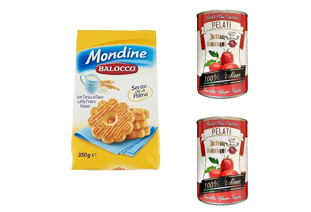 Italian Gourmet E.R. Balocco Mondine Biscuits with rice flour and fresh Italian milk 350g biscuits and cookies + 400g cans of 100% cooked Italian tomatoes
