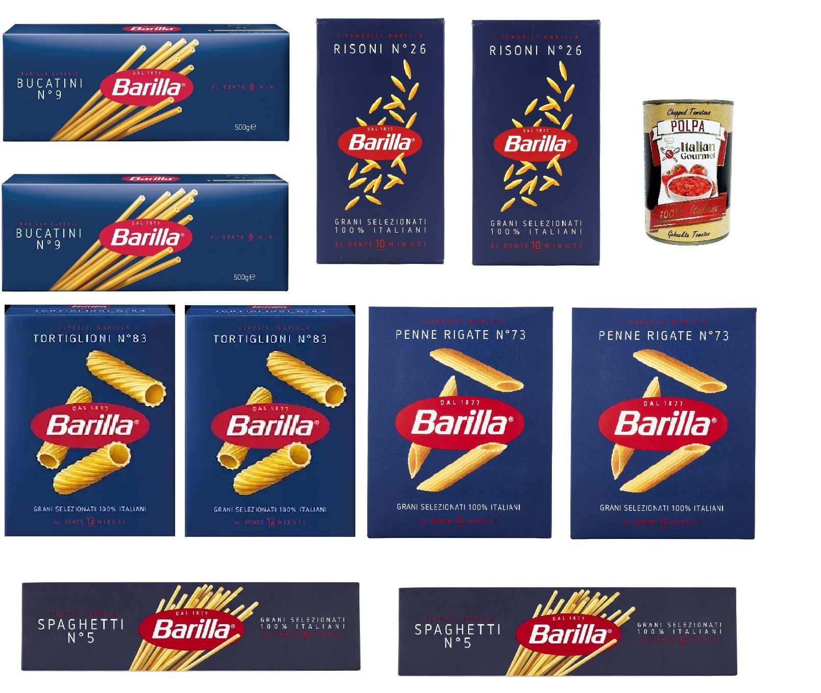 Barilla Essential Lot de 10 spaghetti Bucatini Penne rigate Risoni Tortiglioni 10 x 500 g Polpa Gourme italienne 400 g