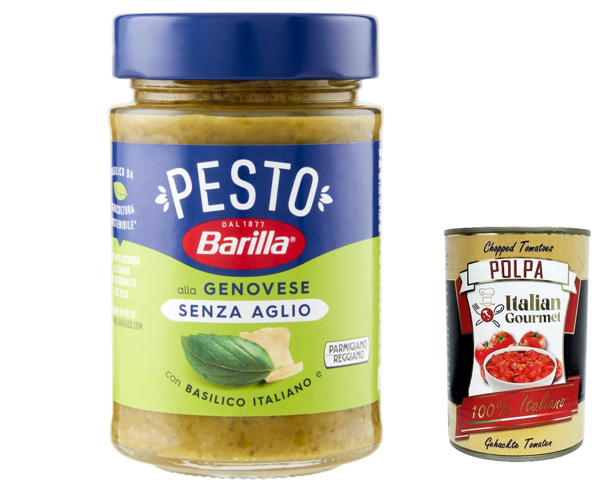 Italian Gourmet E.R. Barilla Pesto alla Genovese Senza Aglio 3-pack of gluten-free pasta sauces 190g Our classic with 100% Italian basil and no garlic + gourmet Italian polpa 400g