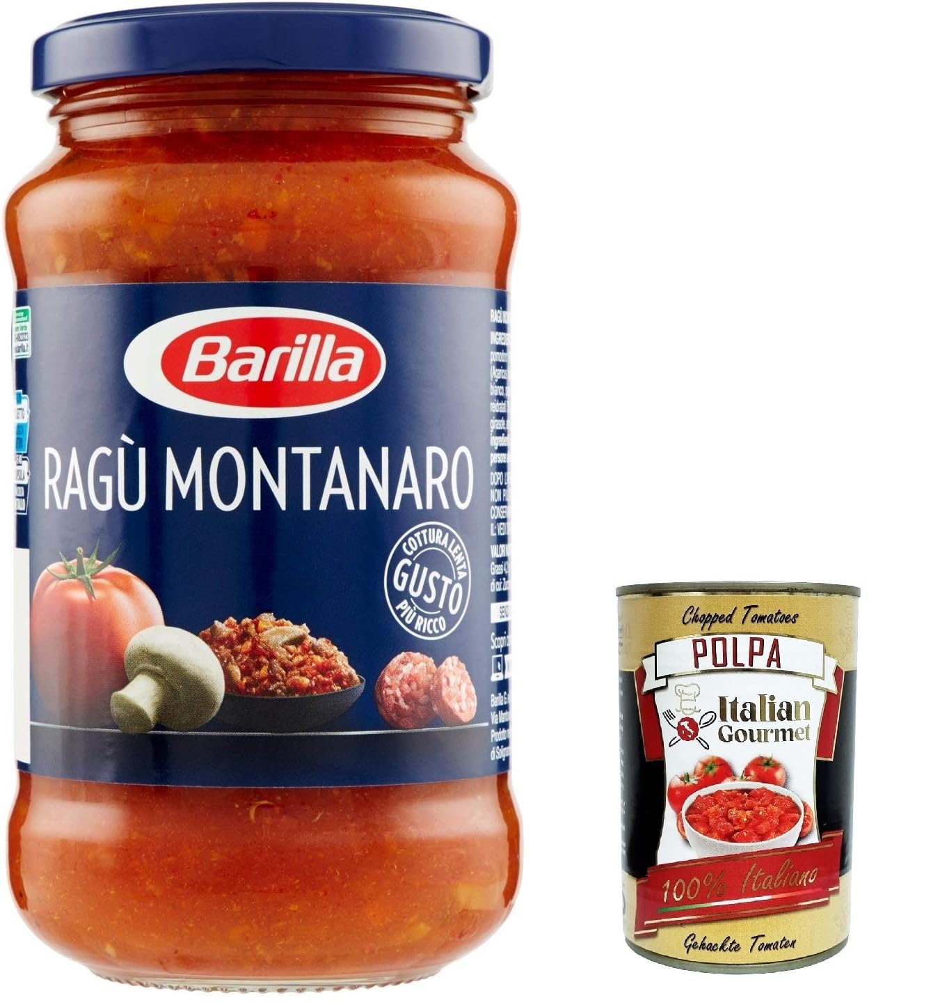 Italian Gourmet E.R. Barilla Rag Montanaro Pasta Sauces with Sausages and Mushrooms 400 g from Italy + Italian Gourmet Polpa 400 g