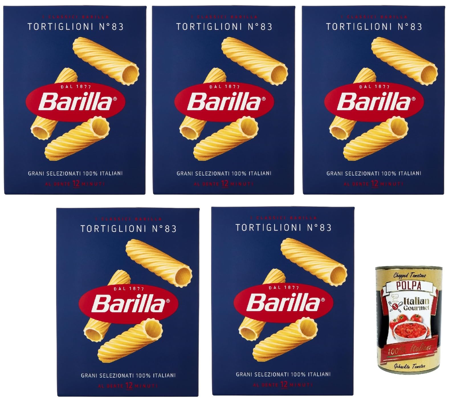 Italian Gourmet E.R. Barilla Tortiglioni No. 83 Pack of 5 100% Italian pasta made with durum wheat semolina 500g + Italian Gourmet Polpa di Pomodoro 400g can