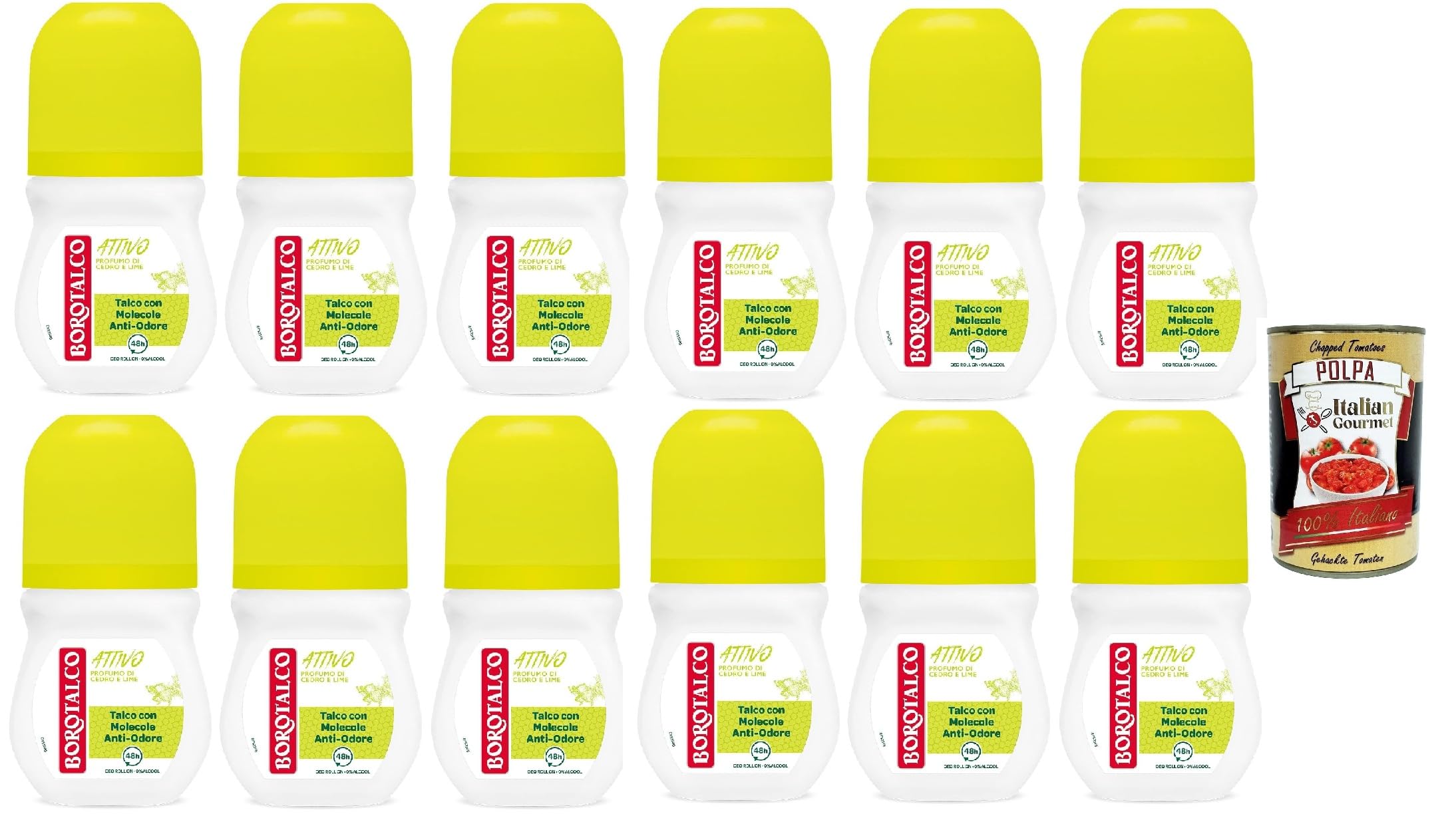 Borotalco Lot de 12 déodorants Roll On Active Giallo sans alcool et avec talc avec molécules anti-odeurs, 48h, parfum de cèdre et de citron vert, 50 ml Polpa italien Gourmet 400 g