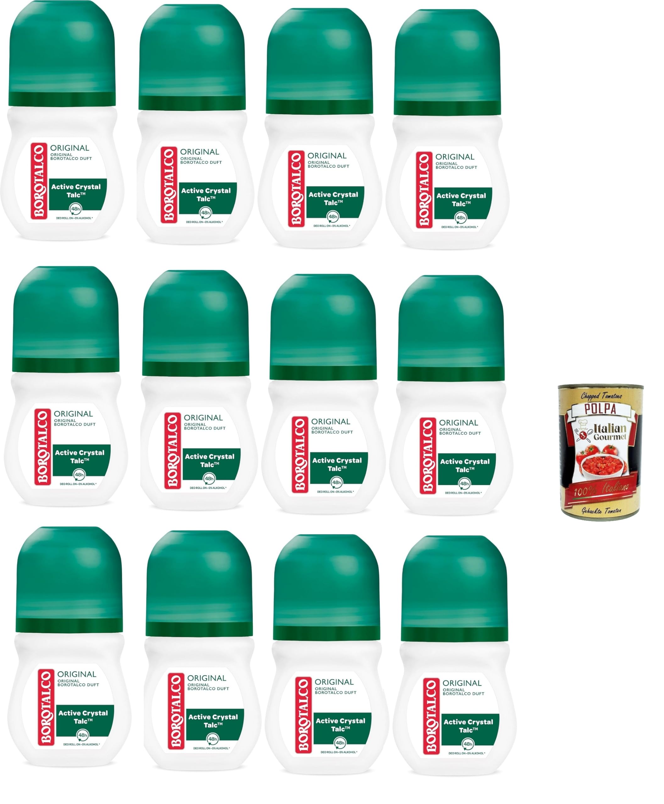 Borotalco Original Déodorant roll-on avec talc avec cristaux actifs, triple protection sèche sans alcool, parfum Borotalco – Lot de 12 flacons de 50 ml Italian Gourmet polpa 400 g