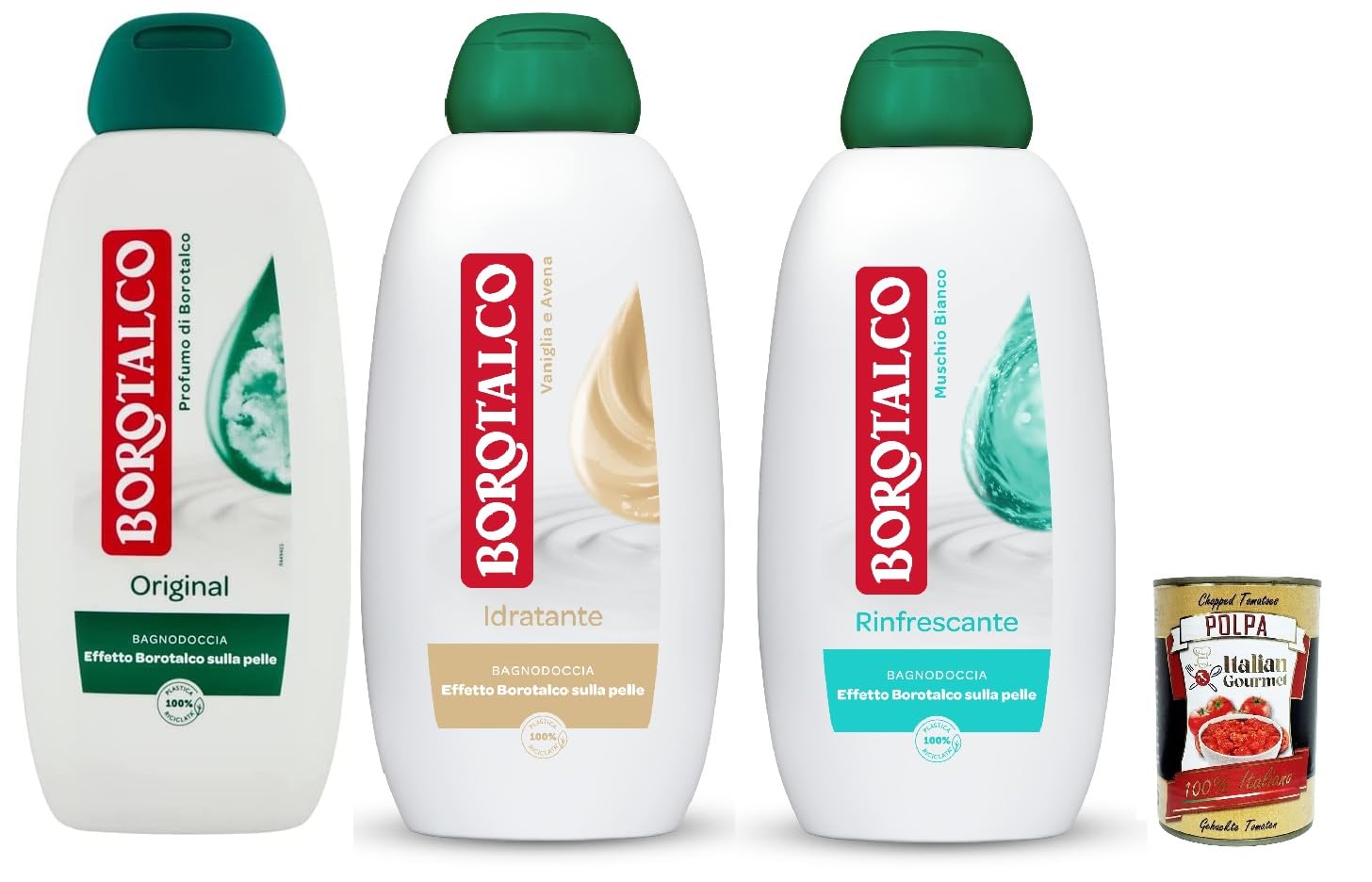 Ingredients: Glycereth-2 Cocoate, Glycerin, Cocamidopropyl Betaine, Styrene Acrylic Copolymer, Tetrasodium Glutamate Diacetate, Benzyl Salicylate, Sodium Benzoate, Coco-Glucoside, Citric Acid, DMDM Hydantoin, Glyceryl Oleum, Aqua, Sodium Laureth Sulfate, Geraniol, Limonene, Linalool, Decyl Glucoside, PEG-7 Glyceryl Cocoate, Parfum, Sodium Chloride, Sodium PCA, PEG-200 Hydrogen Glyceryl Palmate, Sodium Hydroxide, Polysorbate 20, Alfere, Isomethyl Ionone, Citronellol, Coumarin SAFETY WARNING Dermatologically tested, formulated to cleanse the skin while preserving itOriginal borotalc fragrance from 1904. A distinctive and timeless bouquet that combines the freshness of citrus with a soft white floral heart on a talc base. Gentle on skin and planet thanks to the recyclable bottle made from 100 recycled plastic. Since 1904, the iconic Borotalco fragrance has always been able to create sweet memories thanks to its soothing sensation of well-being and comfort. The creamy formula, rich in effective moisturizers, nourishes the skin and releases the incomparable effect of borotalcum powder. Dermatologically tested, it respects the skin's physiological pH. This original shower gel with a borotalc fragrance leaves your skin soft, smooth, and velvety, and gives you an incomparable borotalc scent. Italian pomade.Borotalco - Pack test de bain douche au parfum borotalc - Formule avec agents hydratants - Effet borotalc sur la peau - Testé dermatologiquement - 3 x 450 ml Polpa Italian Gourmet 400 gDESCRIPTION DU PRODUIT DESCRIPTION DU PRODUIT Ingrédients : Glycereth-2 Cocoat Glycerin Cocamidopropyl Betana Styrene Acryl Copolymère Tetrasodium Glutamate Diacetate Benzyl Salicylate Sodium Benzoate Coco-Glucoside Citric Acid DMDM Hydantoïne Glyceryl Ole. Aqua Sodium Laureth Sulfate Geraniol Limonene Linalol Decyl Glucoside PEG-7 Glyceryl Cocoate Parfum Sodium Chlorure Sodium PCA PEG-200 HydrogenGlyceryl Palmate Sodium Hydroxide Polysorbate 20 Alfere IsomethyL'Ionone Citronellol Coumarin AVERTISSEMENT DE SÉCURITÉ Testé dermatologiquement, formulé pour nettoyer la peau tout en la préservantParfum original au talc borotal de 1904. Un bouquet distinctif et intemporel qui allie la fraîcheur des agrumes avec un cœur floral blanc doux sur fond talcate. Doux pour la peau et la planète grâce à la bouteille recyclable en plastique 100 recyclé. Depuis 1904, le parfum emblématique de Borotalco a toujours été capable de créer de doux souvenirs grâce à sa sensation apaisante de bien-être et de confort. Formule crémeuse, riche en hydratants efficaces, nourrit la peau et libère l'effet incomparable du borotalcum, testé dermatologiquement, respecte l'aspect pH physiologique de la peau. Bain douche original au parfum de borotalc, laisse votre peau douce, lisse et veloutée et vous donne un parfum incomparable de talc borotal. Polpa di pomodoro italien.