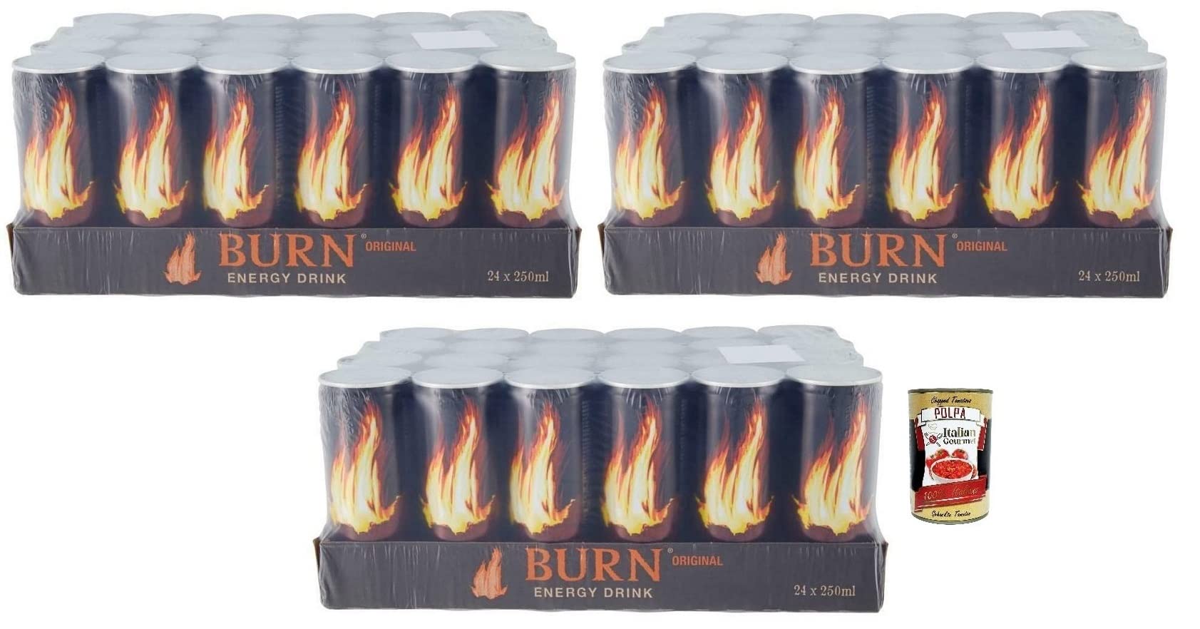 Burn Energy Drink Original Lot de 72 boissons énergisantes gazeuses contenant de la taurine, de la caféine, du guarana et des vitamines B 250 ml boîte italienne Gourmet Polpa di Pomodoro 400 g