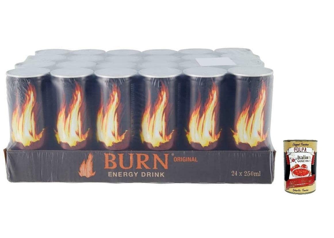 Burn Energy Drink Original Lot de 24 boissons énergisantes gazeuses avec ajout de taurine, caféine, guarana et vitamines B Boîte jetable de 250 ml Italian Gourmet Polpa di Pomodoro 400 g