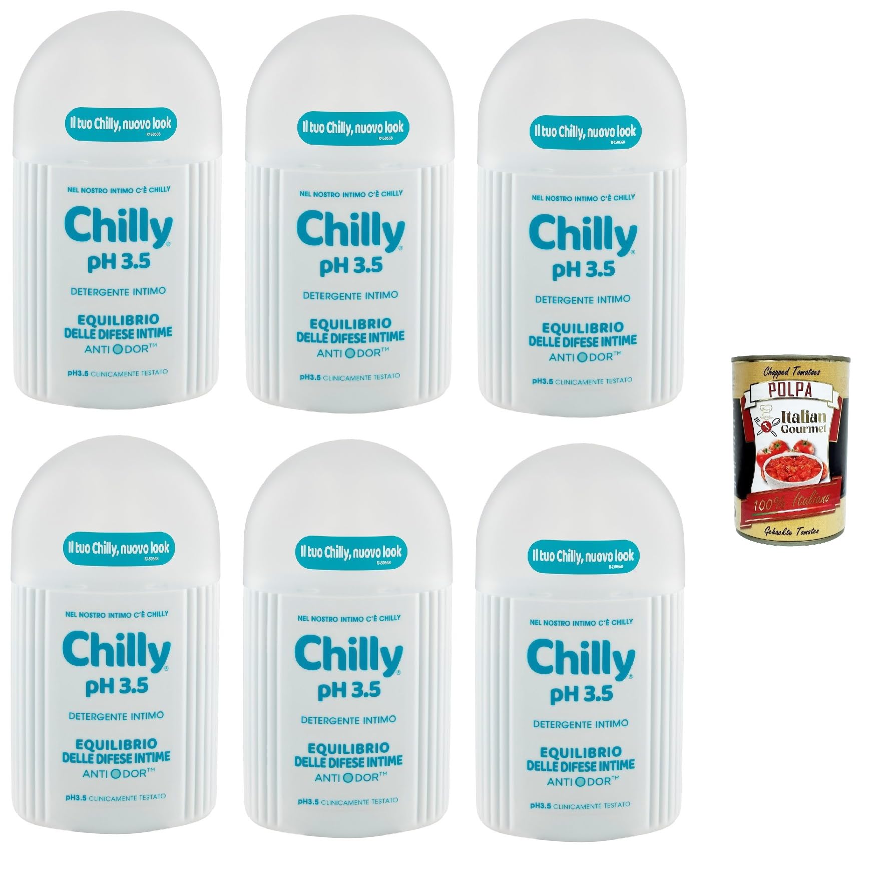 Chilly Nettoyant intime pH 3,5, équilibre pour la défense intime, anti-odeur, formule au pH acide pour stimulation, 6 x 200 ml + Italian Gourmet Polpa 400 g
