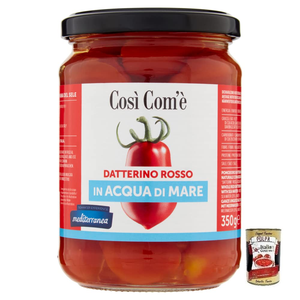 Così Com'è Datterino Rosso, tomate rouge datterino dans l'eau de mer, tomates italiennes, pot de 350 g boîte de 400 g