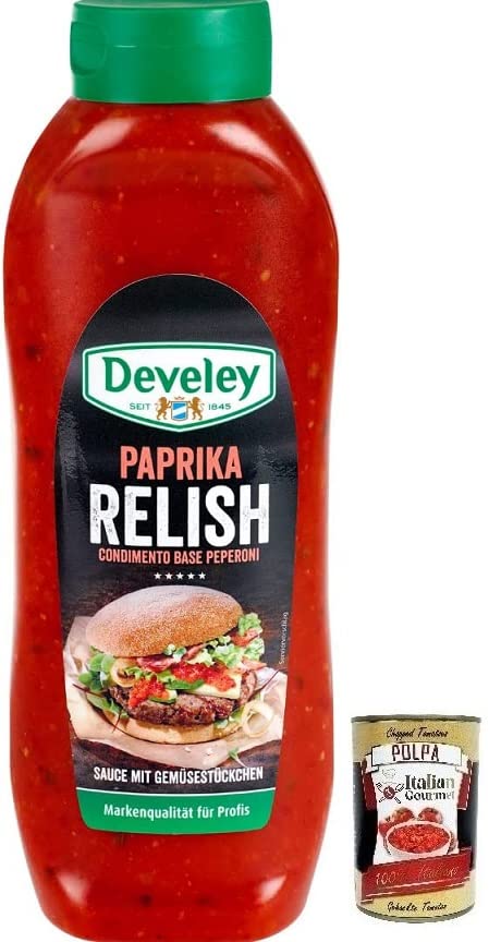 Polpa di Pomodoro - 400g - Pepper Pack - With corn and a mild spice - Here's the new seasoning with colorful chopped vegetables, ideal as a dip for all occasions. Ingredients: water, paprika 20 , sugar, vinegar, onions, carrots, cucumbers, corn 3 , modified corn starch, concentrated lime juice, salt, spices, chili extract, spice extract, thickener (xanthan gum), hibiscus color concentrate. Nutritional values ( ) per 100g ml of product: Energy 432 kJ 102 kcal, Fat 0.4g, of which saturates 0.1g, Carbohydrate 22.1g, of which sugars 18.2g, Protein 0.7g, Salt 2.33g INGREDIENTS Water, paprika 20 , sugar, vinegar, onions, carrots, cucumbers, corn 3 , modified corn starch, concentrated lime juice, salt, spices, chili extract, spice extract, thickener (xanthan gum), hibiscus color concentrate.Develey Paprika Relish Peperoni Sauce à base de poivrons 875 ml boîte de 400 gDESCRIPTION DU PRODUIT DESCRIPTION DU PRODUIT Polpa di Pomodoro - 400 g - La charge de poivrons - Avec maïs et un léger piquant - Voici le nouvel assaisonnement avec des légumes hachés colorés, idéal comme trempette pour toutes les occasions. Ingrédients : eau, paprika 20 , sucre, vinaigre de vie, oignons, carottes, concombres, maïs 3 , amidon de maïs modifié, jus de citron vert concentré de jus de citron vert, sel, épices, extrait de piment, extrait d'épices, épaississant (gomme xanthane), concentré de couleur hibiscus. Valeurs nutritionnelles ( ) pour 100 g ml produit : valeur énergétique 432 kJ 102 kcal graisses 0,4 g, dont acides gras saturés 0,1 g glucides 22,1 g, dont sucres 18,2 g protéines 0,7 sel 2,33 INGRÉDIENTS Eau, paprika 20 , sucre, vinaigre de vie, oignons, carottes, concombres, maïs 3 , amidon de maïs modifié, jus de citron vert concentré de jus de citron vert, sel, épices, extrait de piment, extrait d'épices, épaississant (gomme xanthane), concentré de couleur hibiscus.