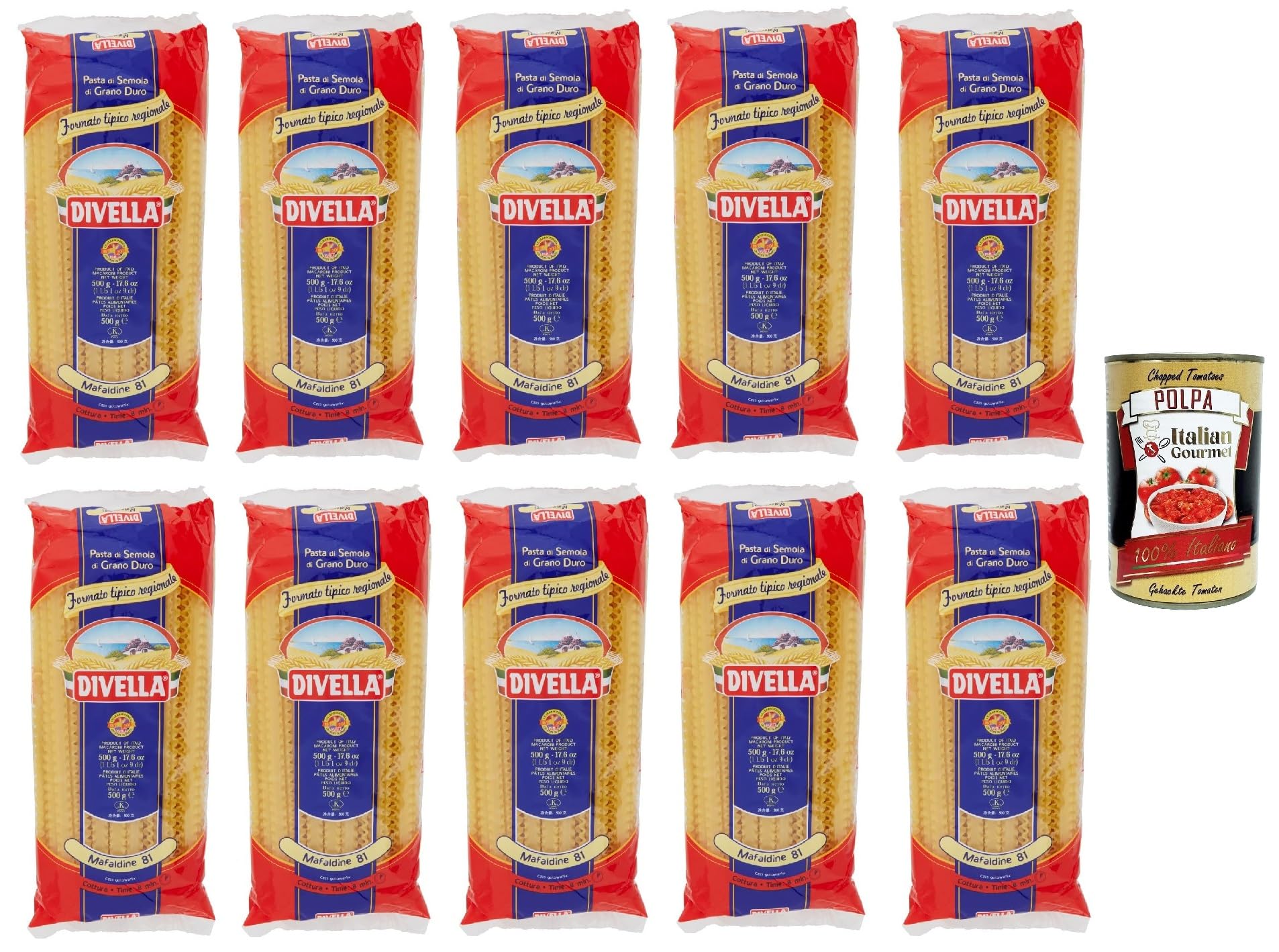 Divella Mafaldine N. 81 Lot de 10 pâtes à la semoule de blé dur 500 g boîte italienne Gourmet Polpa di Pomodoro 400 g