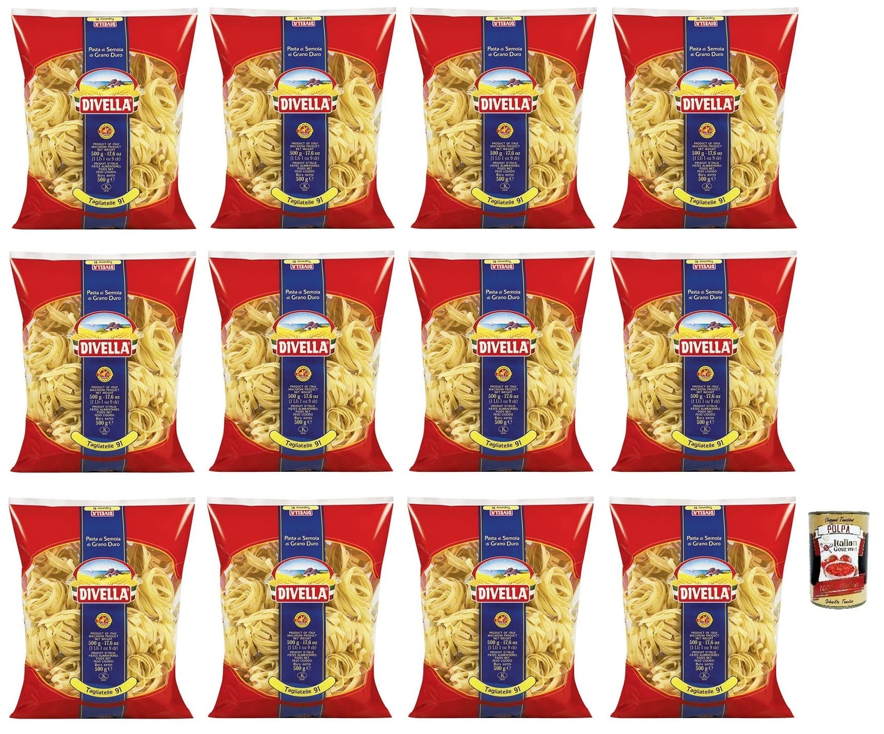 Divella Lot de 12 tagliatelles N 91 Pâtes de blé dur 500 g boîte Italian Gourmet Polpa di Pomodoro 400 g