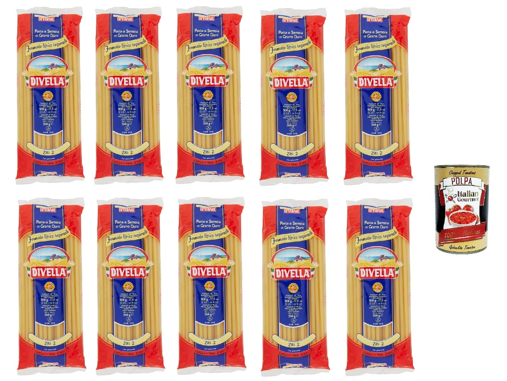 Divella Ziti N. 2 Lot de 10 pâtes à la semoule de blé dur 500 g boîte italienne Gourmet Polpa di Pomodoro 400 g