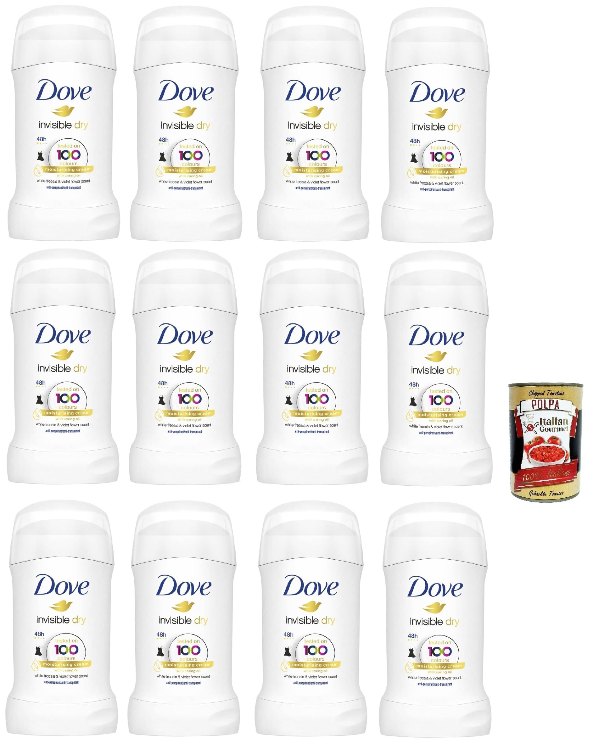 Ingredients: Cyclopentasiloxane, Aluminum Zirconium Tetrachlorohydrex GLY, Stearyl Alcohol, C12-15 Alkyl Benzoate, PPG-14 Butyl Ether, Hydrogenated Castor Oil, Parfum, Dimethicone, Polyethylene, Steareth-100, Helianthus Annuus Seed Oil, BHT, Tocopherol. Acetate, alpha-isomethyl ionone, benzyl, benzyl, benzyl salicylate, cinnamyl alcohol, citronellol, coumarin, geraniol, hexyl cinnamal, hydroxycitronellal, isoeugenol, limonene, linalool. INGREDIENTS Ingredients: Cyclopentasiloxane, Aluminum Zirconium Tetrachlorohydrex GLY, Stearyl Alcohol, C12-15 Alkyl Benzoate, PPG-14 Butyl Ether, Hydrogenated Castor Oil, Fragrance (Parfum), Dimethicone, Polyethylene, Steareth-100, Sunflower Seed Oil (Helianthus Annuus), BHT, Tocopherol Acetate, Alpha-Isomethyl Ionone, Benzyl Salicylate, Cinnamyl Alcohol, Citronellol, Coumarin, Geraniol, Hexyl Cinnamal, Hydroxycitronellal, Isoeugenol, Limonene, Linalool. SAFETY WARNING Precautions: Shake well before use and apply to underarms from a distance of at least 15 cm. Allow to dry. Warnings: Do not apply to broken skin. Discontinue use if irritation occurs. Avoid direct breathing. Do not use excess product in a well-ventilated area with short bursts. Do not spray near eyes. Use only as directed. Danger: Extremely flammable aerosol. Pressurized: may burst when heated. Keep away from heat sources, heated surfaces, sparks, flames, and other ignition sources. No smoking. Do not spray near an open flame or other ignition source. Do not pierce or burn, even after use. Protect from sunlight. Do not expose to temperatures exceeding 50 C. Keep out of reach of children. See moreDove Deodorants: Take care of your sensitive underarm skin with deodorants formulated with dermatologically tested ingredients. Try all the scents: Experience the delicate fragrance of the original, the freshness of Go Fresh cucumber and green tea, and feel confident and dry without leaving marks on your clothes. Up to 48-hour protection: It helps regulate perspiration with protection and moisture control for up to 48 hours after each application. Formula: Formulated with ¼ iconic moisturizing cream, it provides hydration and softness to the skin, even after hair removal. Dove Invisible Dry Stick: The no-drink deodorant, the Invisible Dry Stick with nourishing oil cares for the delicate skin of your underarms and offers all-day protection without leaving marks on your clothes. Free 400g Italian gourmet bottle.Dove Invisible Dry Stick Déodorant anti-drainant en stick avec crème hydratante 1 4 hydratante, zéro tâches, 48 heures, à l'huile nutritive, 12 x 40 ml Italian Gourmet polpa 400 gDESCRIPTION DU PRODUIT DESCRIPTION DU PRODUIT Ingrédients : cyclopentasiloxane, Aluminum Zirconium Tetrachlorohydrex GLY, alcool stéarylique, C12-15 Alkyl Benzoate, PPG-14 Butyl Ether, Hydrogenated Castor Oil, Parfum, Dimethicone, Polyethylene, Steareth-100, Helianthus Annuus Seed Oil, BHT, tocophérol. Acétate, alpha-isomethyl ionone, benzyle, benzyle, salicylate de benzyle, alcool cinnamyle, citronellol, coumarine, géraniol, hexyl cinnamal, hydroxycitronellal, isoeugenol, limonène, linalool. INGRÉDIENTS Ingrédients : cyclopentasiloxane, Aluminum Zirconium Tetrachlorohydrex GLY, alcool stéarylique, C12-15 Alkyl Benzoate, PPG-14 Butyl Ether, Hydrogenated Castor Oil, Parfum, Dimethicone, Polyethylene, Steareth-100, Helianthus Annuus Seed Oil, BHT, tocophérol. Acétate, alpha-isomethyl ionone, benzyle, benzyle, salicylate de benzyle, alcool cinnamyle, citronellol, coumarine, géraniol, hexyl cinnamal, hydroxycitronellal, isoeugenol, limonène, linalool. AVERTISSEMENT DE SÉCURITÉ Précautions : bien agiter avant utilisation et appliquer sur les aisselles à une distance d'au moins 15 cm. Laissez sécher. Avertissements : ne pas appliquer sur la peau blessée. Suspension de l'utilisation en cas d'irritation. Évitez de respirer directement. Ne pas utiliser d'excès de produit dans un endroit ventilé avec de courtes éclaboussures. Ne pas vaporiser près des yeux. À utiliser uniquement comme indiqué. Danger : aérosol extrêmement inflammable. Ripient sous pression : il peut éclater lorsqu'il est chauffé. Tenir à l'écart des sources de chaleur, des surfaces chauffées, des étincelles, des flammes et d'autres sources de déclenchement. Ne pas fumer. Ne vaporisez pas de flamme libre ou toute autre source d'inflammation. Ne pas percer ou brûler même après utilisation. Protéger de la lumière du soleil. Ne pas exposer à des températures supérieures à 50 C. Tenir hors de portée des enfants. Voir plusDéodorants Dove : prenez soin de la peau sensible de vos aisselles en proposant des déodorants aux formules testées dermatologiquement. Essayez tous les parfums : essayez le parfum délicat de la variante originale, la fraîcheur du concombre Go Fresh et du thé vert et sentez-vous en sécurité, sans laisser de traces sur vos vêtements avec des vêtements secs invisibles. Jusqu'à 48 heures de protection : il aide à réguler la transpiration grâce à la protection et à l'humidité jusqu'à 48 heures après chaque application. Formule : formulée avec 1 4 de crème hydratante emblématique où elle apporte hydratation et délicatesse à la peau même après l'épilation. Bâton sec invisible Dove : le déodorant anti-boire, le bâton sec invisible à l'huile nutritive prend soin du cuir des aisselles et offre une protection sans laisser de traces sur les vêtements tout au long de la journée. Flacon gourmet italien gratuit 400 g.