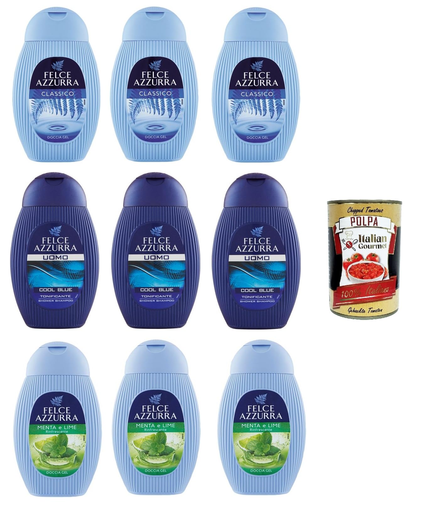 Felce Azzurra Docciagel Classico Coll Blu Uomo, Lime Menta Classico, pack de test classique, bleu homme, citron vert et menthe 9 x 250 ml Polpa Italian Gourmet 400 g