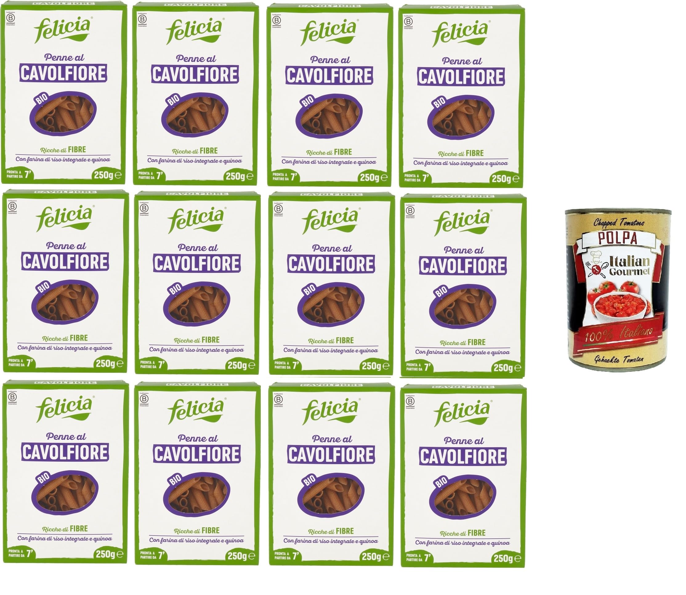 Felicia Penne al Cavolfiore Con farina di riso integrale e quinoa penne de chou-fleur avec farine de riz marron et quinoa 12 x 250 g Italian Gourmet polpa 400 g