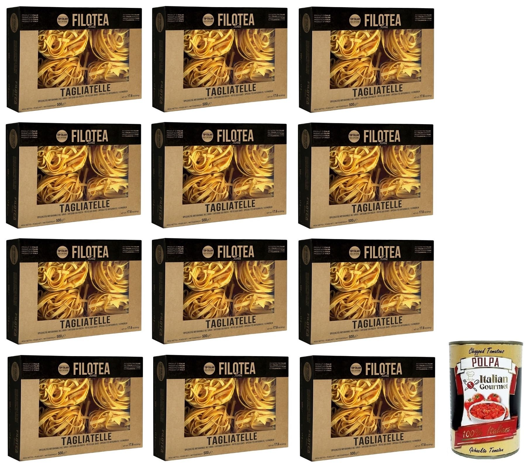 Filotea Lot de 12 pâtes tagliatelles all'Uovo, pâtes aux œufs en matières premières italiennes, paquet de 500 g boîte italienne Gourmet Polpa di Pomodoro 400 g